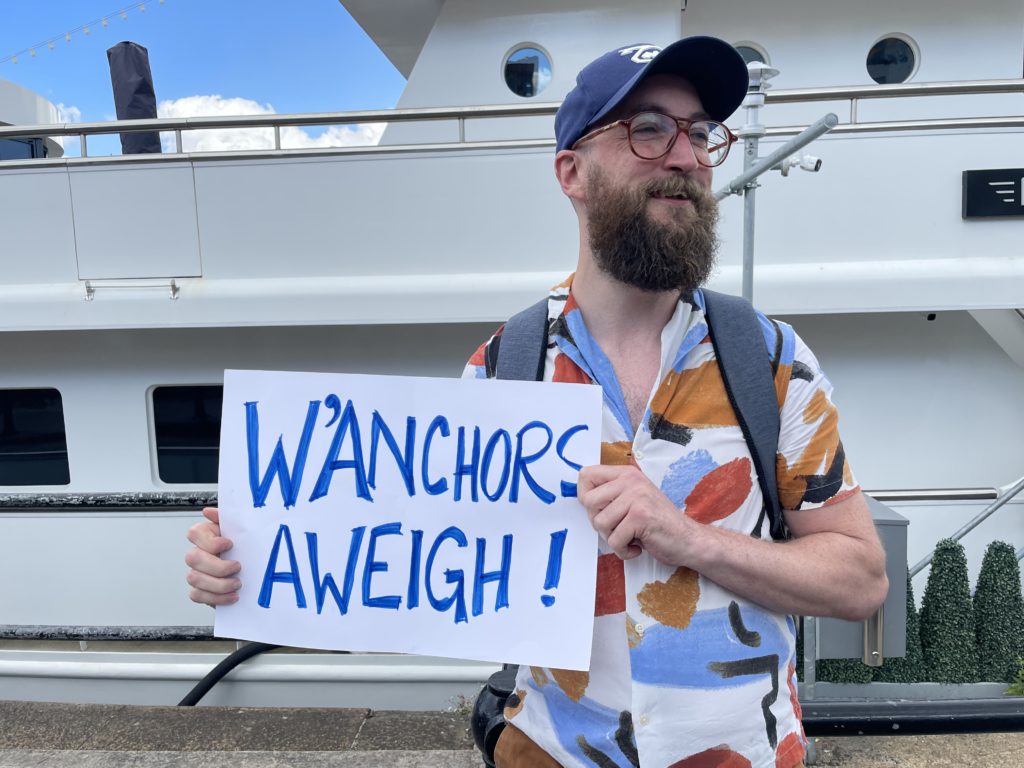 Protesters gathered on the starboard side of the boat on Monday afternoon to allege that real life misconduct was allegedly being carried out by its owners.