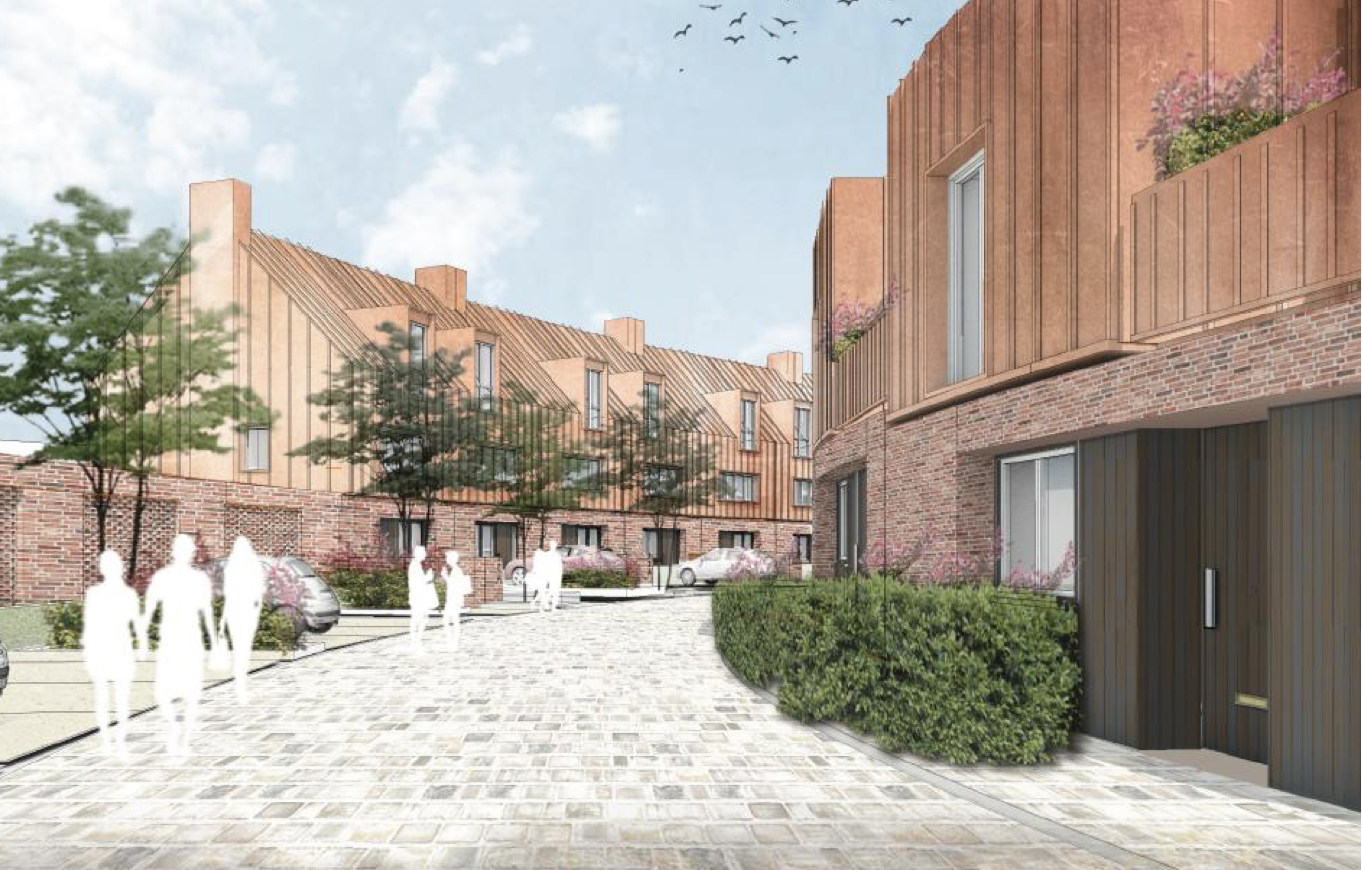 The development will include 13 houses and 17 flats in two four-storey buildings with commercial space on the ground floor.