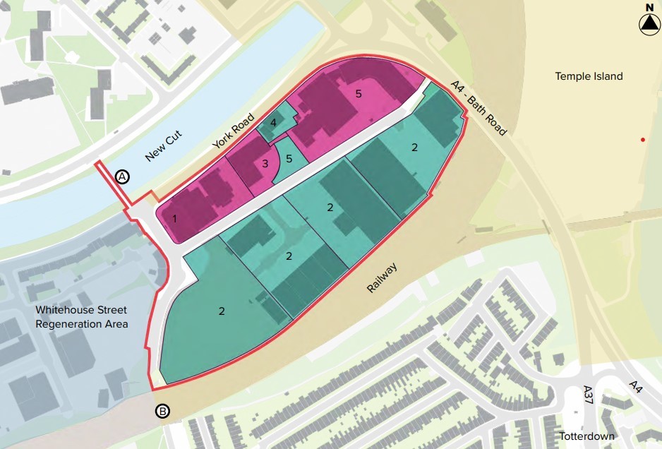 The 5.6-hectare area lies between the Bath Bridge roundabout and the Banana Bridge, and between the river and the railway. It’s currently home to a motorbike shop, a car rental business, and a rock climbing gym, and could soon be completely transformed with 1,500 new homes.
