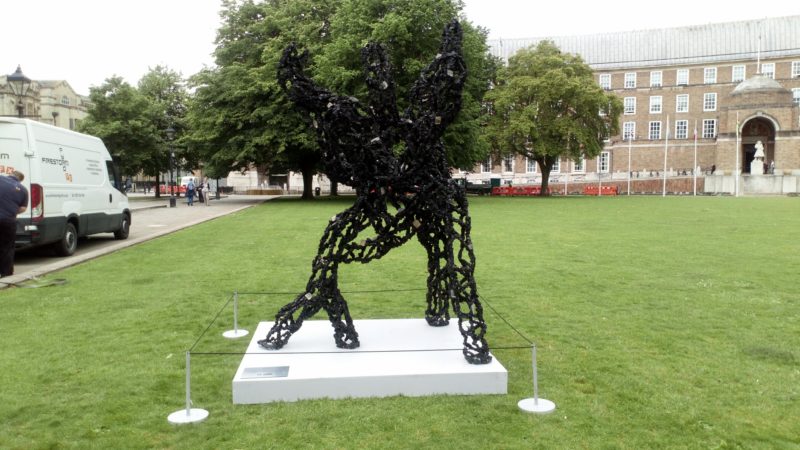 Arriving at College Green, Luke and his team now have the risky task of removing the sculpture from its scaffold, which weighs around the same as the sculpture itself. They remain light-hearted and work with ease and cooperation, placing the sculpture on its plinth. After a swift dust, Luke displays a smart-looking placard, explaining the purpose behind it: making the city’s pollution visible.
