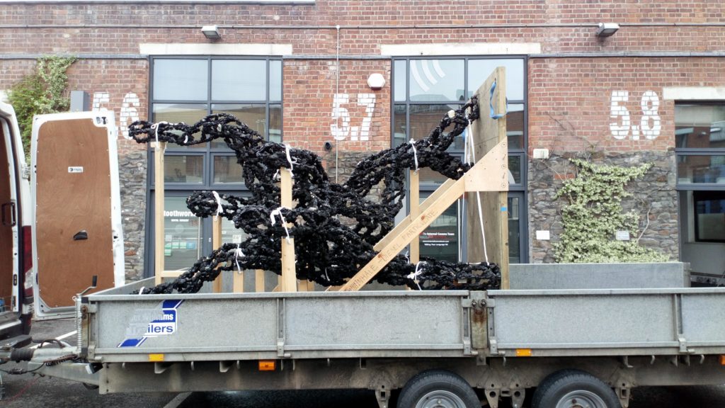 After the cautious transfer of the sculpture from studio to van trailer, the team set off to drive over to College Green. Luke, of course, takes his bike.