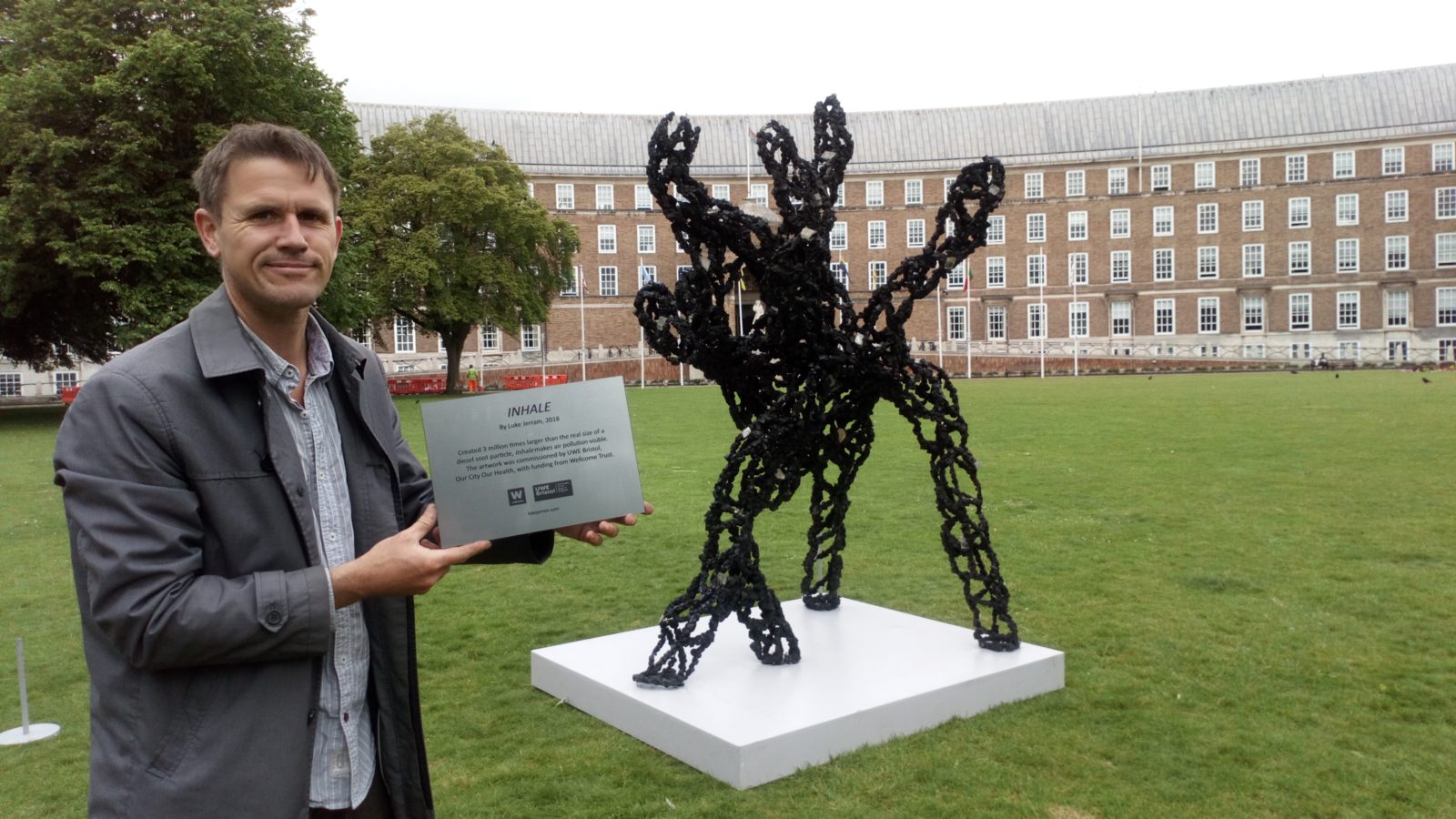 “This artwork, Inhale, is being installed in central Bristol in the lead up to Clean Air Day to raise awareness of the problem of air pollution in our city,” Jerram says. “It depicts a diesel particle – it’s three million times larger than the real particle.