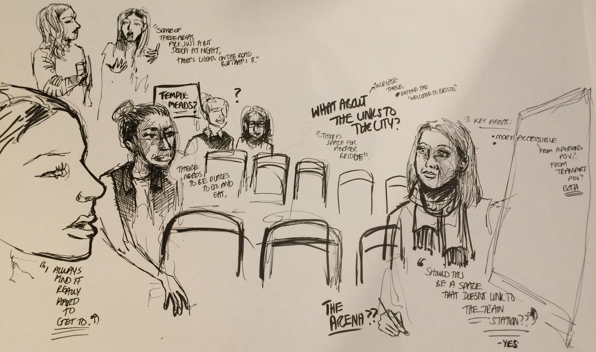 Breaking off into small groups, the panellists and audience members worked together to reimagine parts of the city: Castle Park, the Royal Mail Sorting Office near Bristol Temple Meads, Broadmead, the Carriageworks and Redcliffe Quarter.