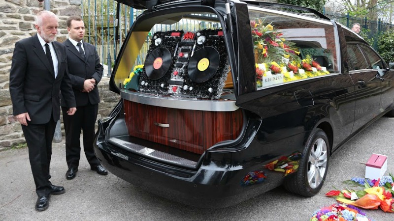 Derek’s body arrived in style at St Agnes Church on Friday morning in a hearse dressed with a floral tribute depicting a pair of record decks.