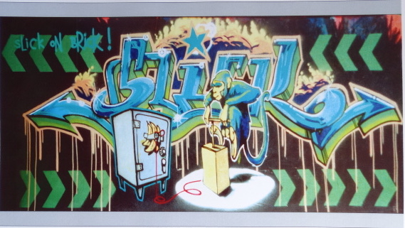 The mural, Slick on Brick, has since been painted over several times, but cracks have revealed tantalising glimpses of the original painted around September 1999 which depicts a monkey blowing up a safe.