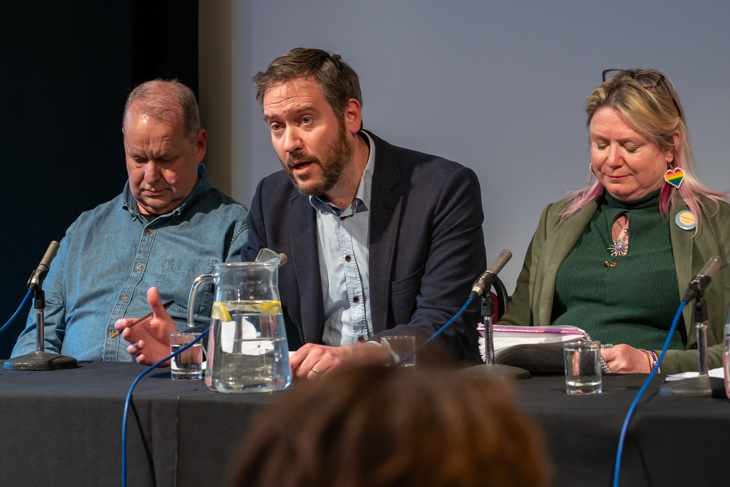 Left to right: independent candidate Ian Scott, Lib Dem Oli Henman and Green Mary Page at the hustings at Watershed
