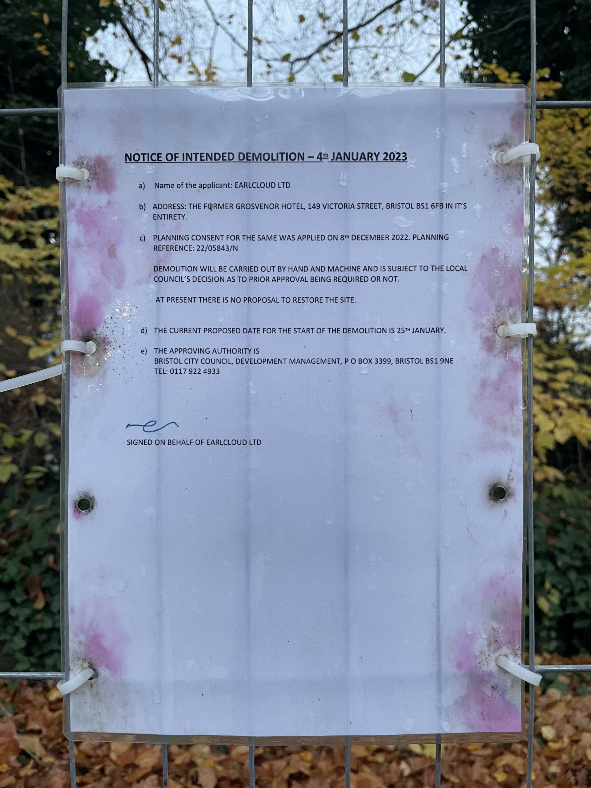 A notice on the fencing surrounding the derelict hotel says that demolition was due to start on January 25 – photo: Martin Booth