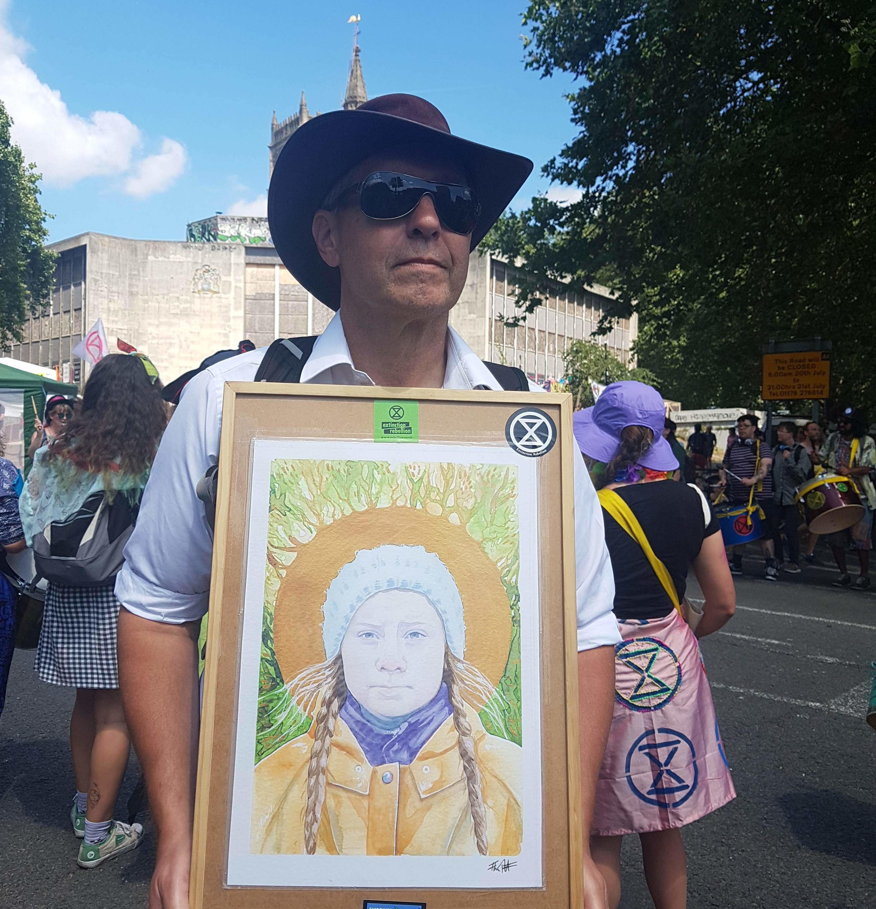 As the samba band strikes up again on High Street, one man stands slightly to the side holding a noticeboard with a poster of environmental activist Greta Thunberg.