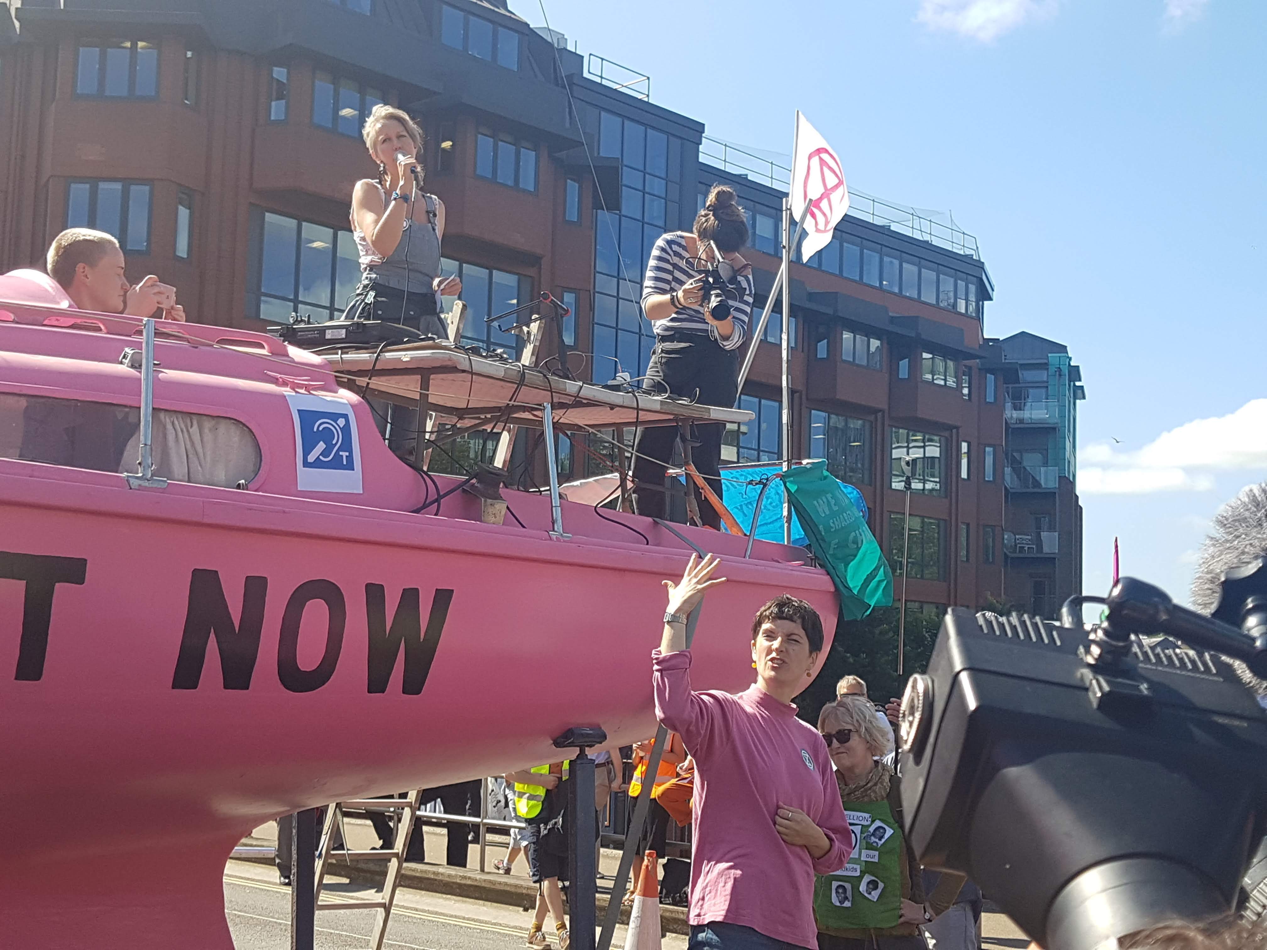 “We are in an absolute crisis, humanity is on the brink of extinction and all efforts need to be focused on averting this crisis and the causes of this crisis,” says Extinction Rebellion co-founder Gail Bradbrook, addressing the growing crowd from on top of the boat.