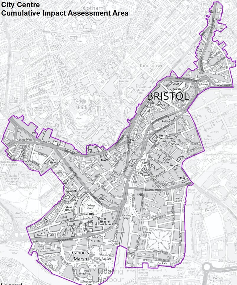 The area to be covered by Bristol City Centre cumulative impact assessment agreed by licensing committee members on March 8. Image: Bristol City Council