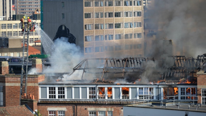 Smoke is starting to clear above Colston Street Halls. Can see major roof damage #bristolfire pic.twitter.com/4LXc5RmWAx