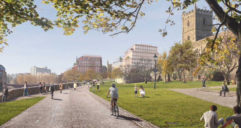 The view of the proposed new buildings from the east side of Castle Park looking west – image: MEPC
