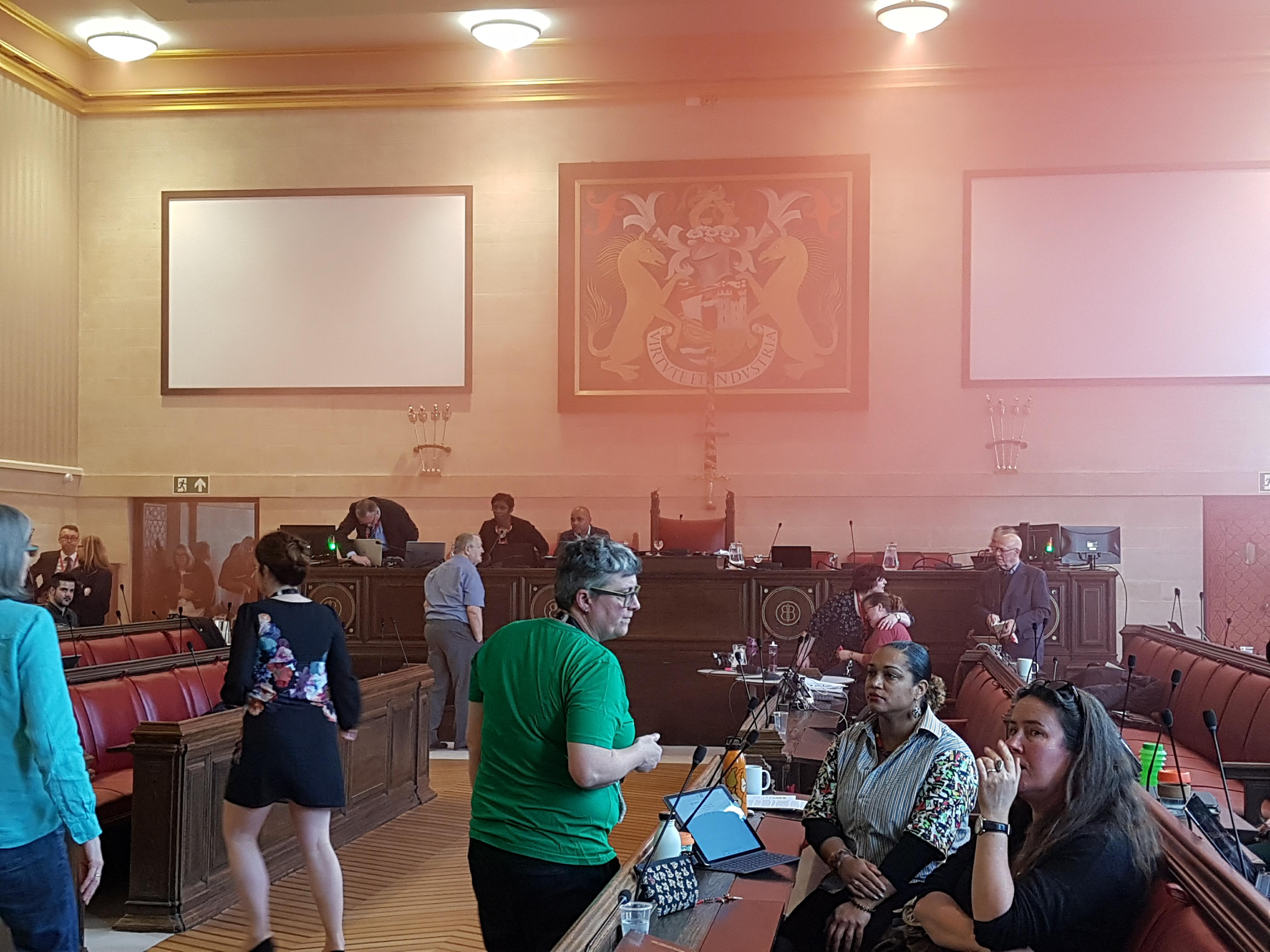 Windows were opened in the council chamber and fans brought in to help clear the lingering red smoke.