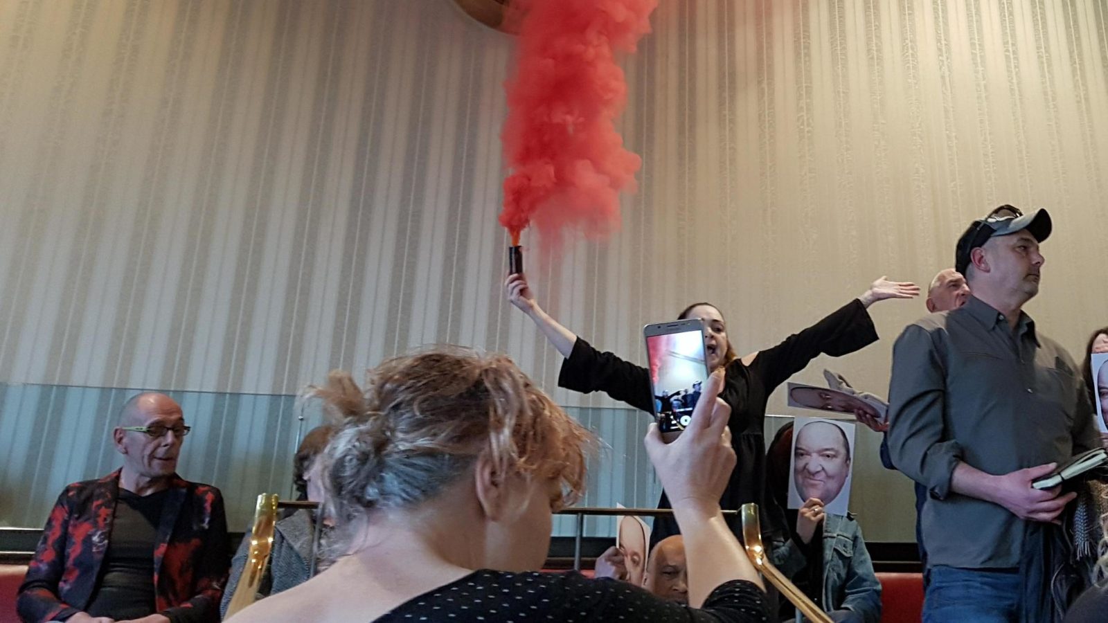 Visibly upset and shaking, the protester let off a smoking red canister in the middle of a packed council budget meeting.