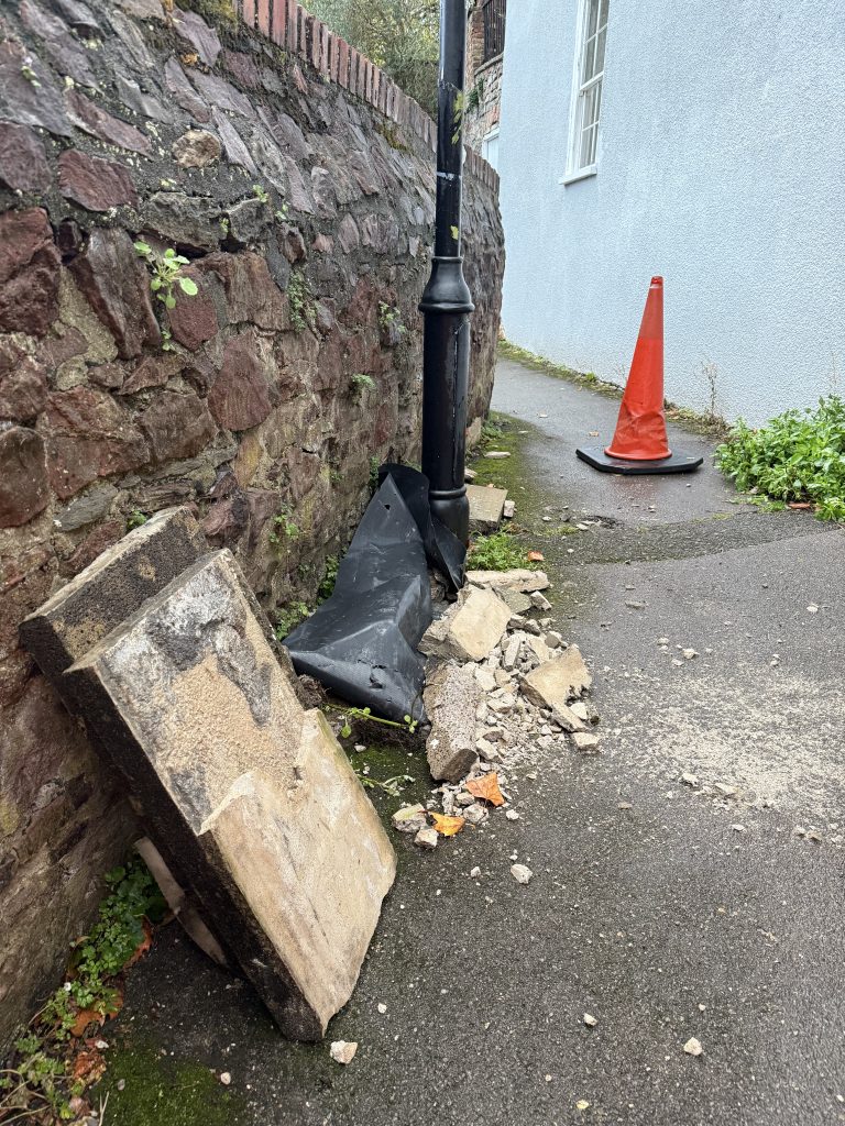 Jones wrote: “There is a large pile of dangerous stones and debris which appear to have fallen from a roof nearby and if any further falls happen they could seriously injure someone.”