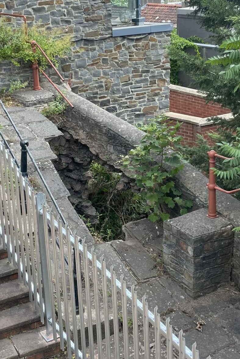 A full repair has still not happened, with a gaping hole still visible close to the top of the path where the wall collapsed into the back garden of the Mardyke pub.