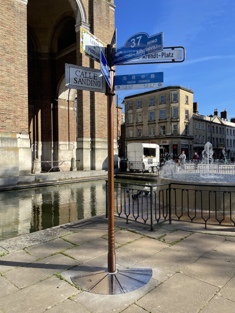 A signpost on College Green features street signs from each of Bristol’s twin cities – photo: Martin Booth