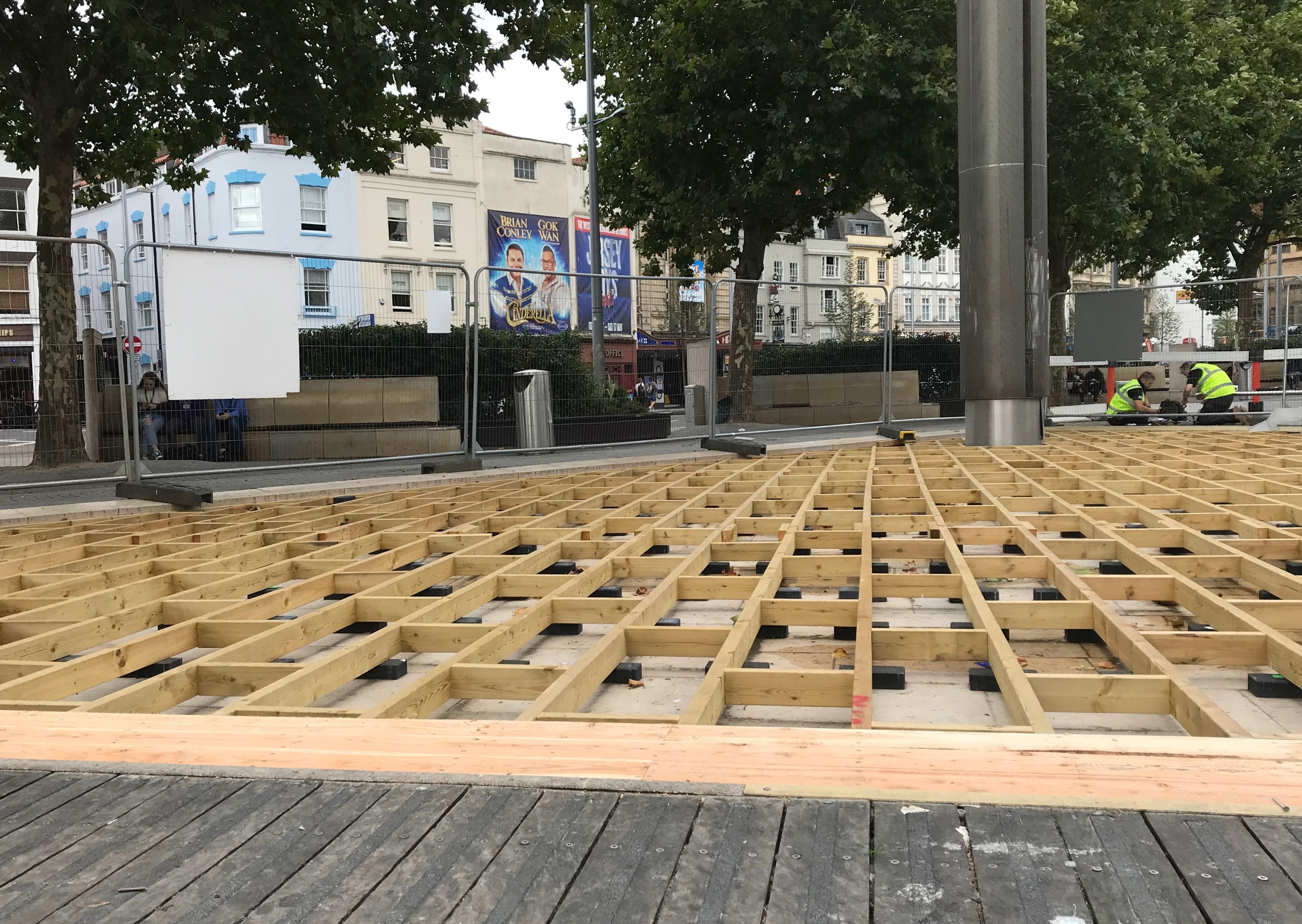 Work is currently underway to build a wooden decking over one of the fountains in the centre in order to create a new home for the Harbourside Market.