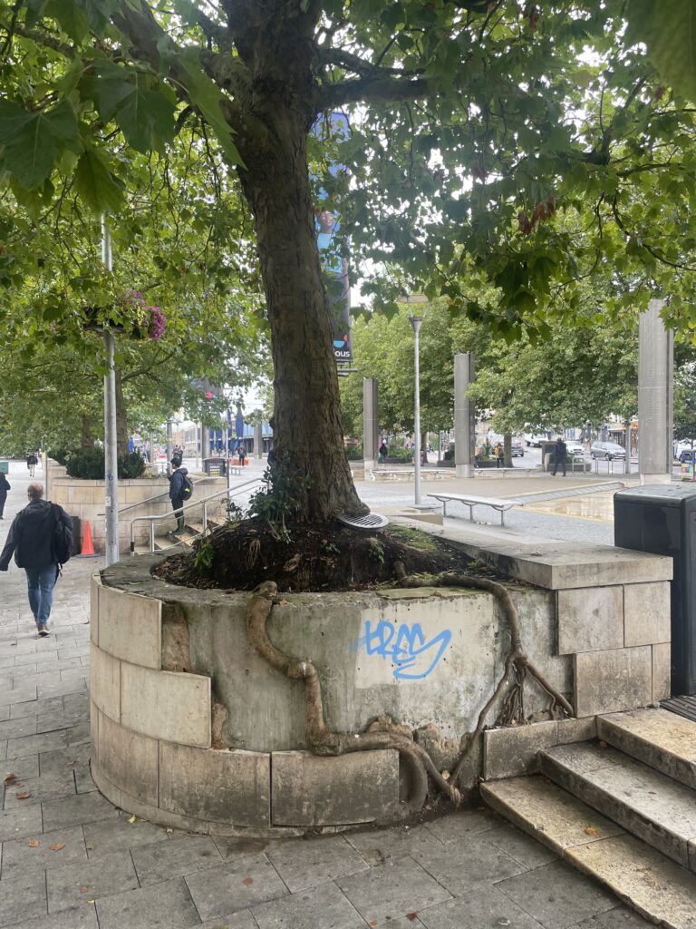 Five London plane trees will be removed and replaced with trees more suitable for the limestone planters – photo: Martin Booth