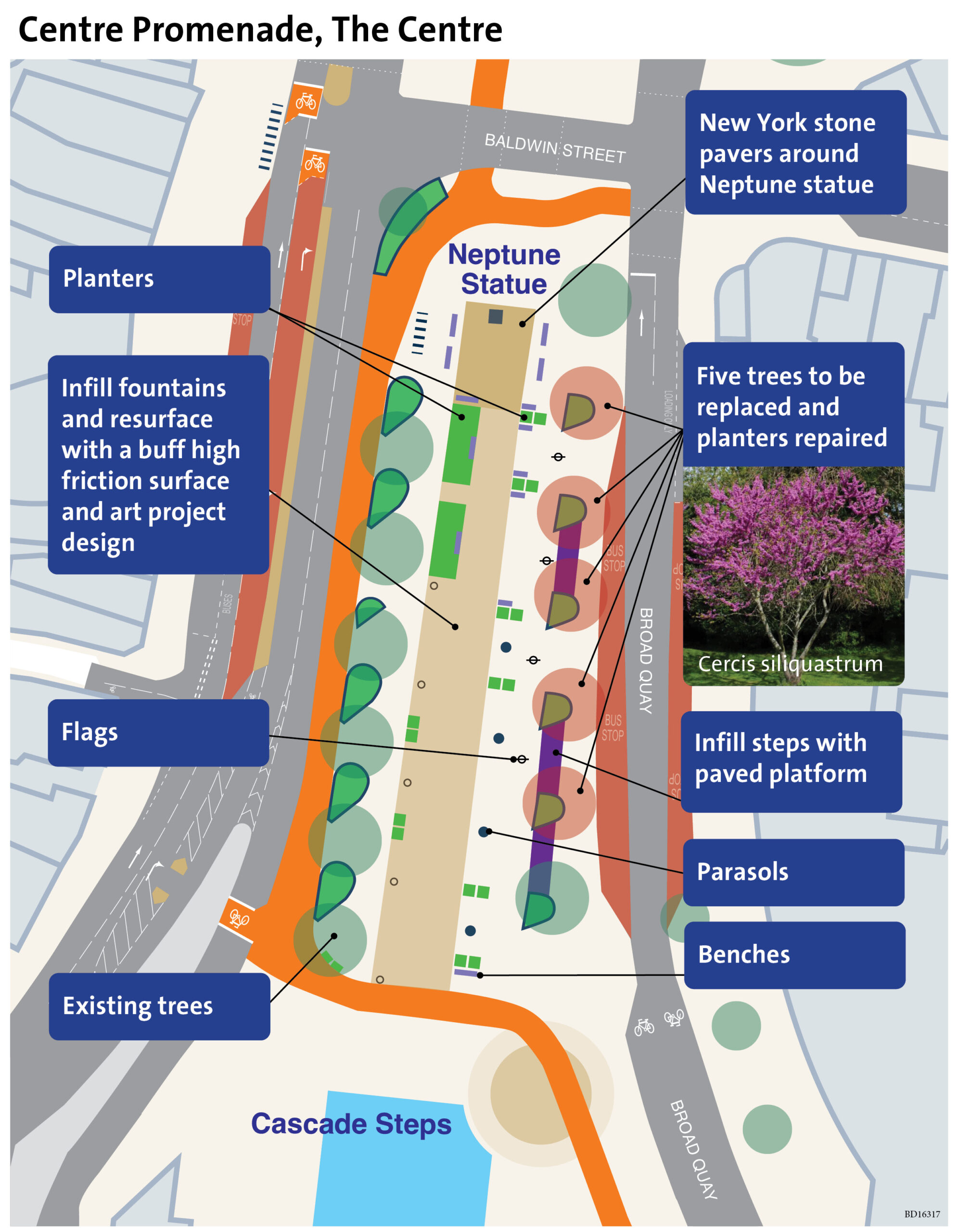 The three sunken fountains will be filled in and five trees next to Broad Quay that have outgrown their planters will be removed during the works that are set to be carried out in early 2025 and take up to three months to complete.