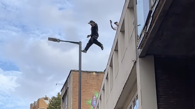 The London-based social media personality effortlessly jumped off a tall building on Fairfax street in central Bristol onto a nearby lamp post, before sliding down and hopping off at the bottom as onlookers watched and filmed in amazement from Union Street above.