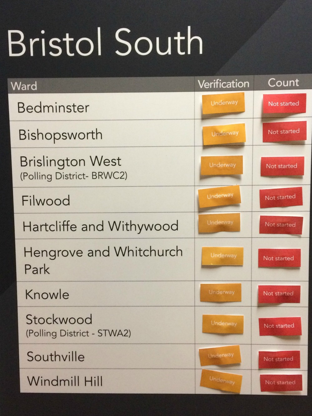 The verification process has started for both Bristol East and Bristol West. Counting is yet to begin.
