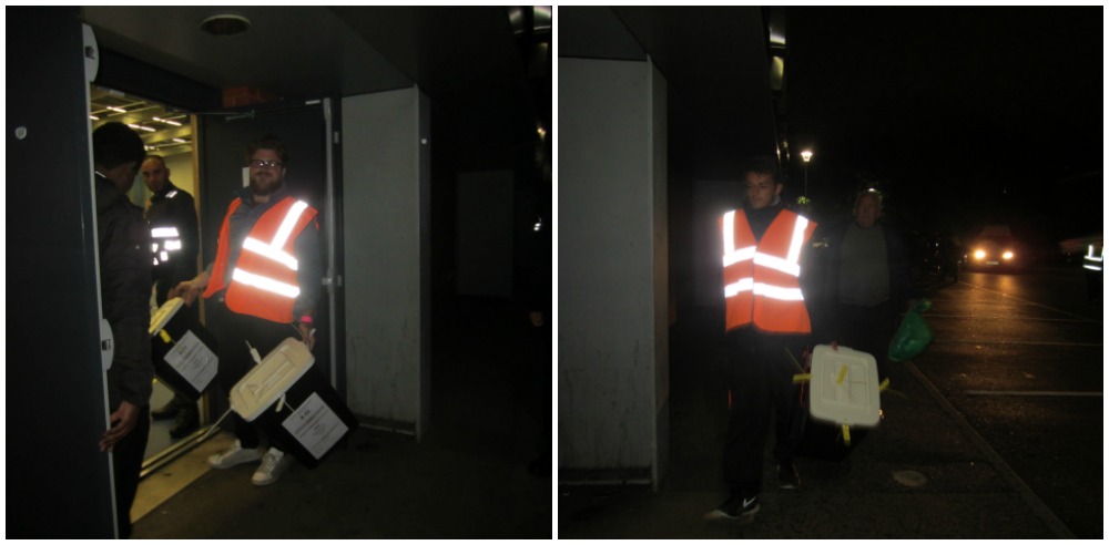 A slow trickle of ballot boxes is arriving for the Bristol West count, while the boxes for Bristol East are taken in through a second door further down.
