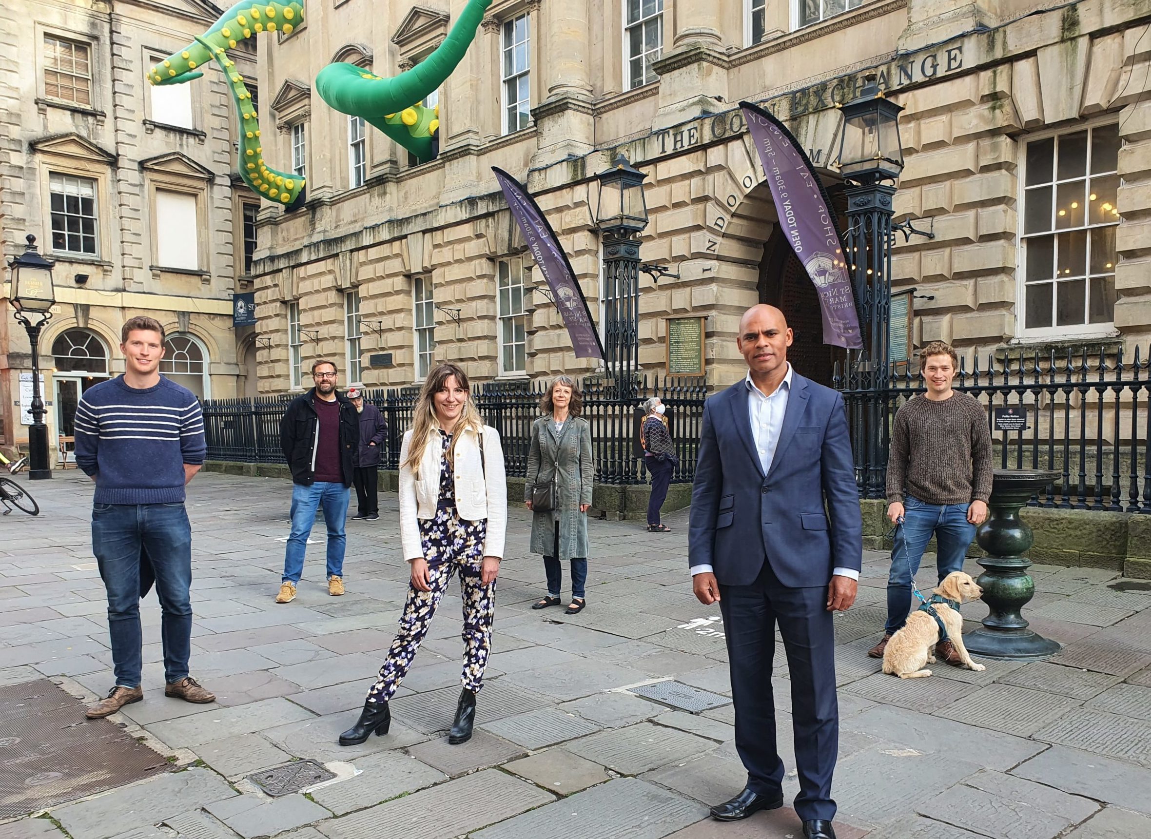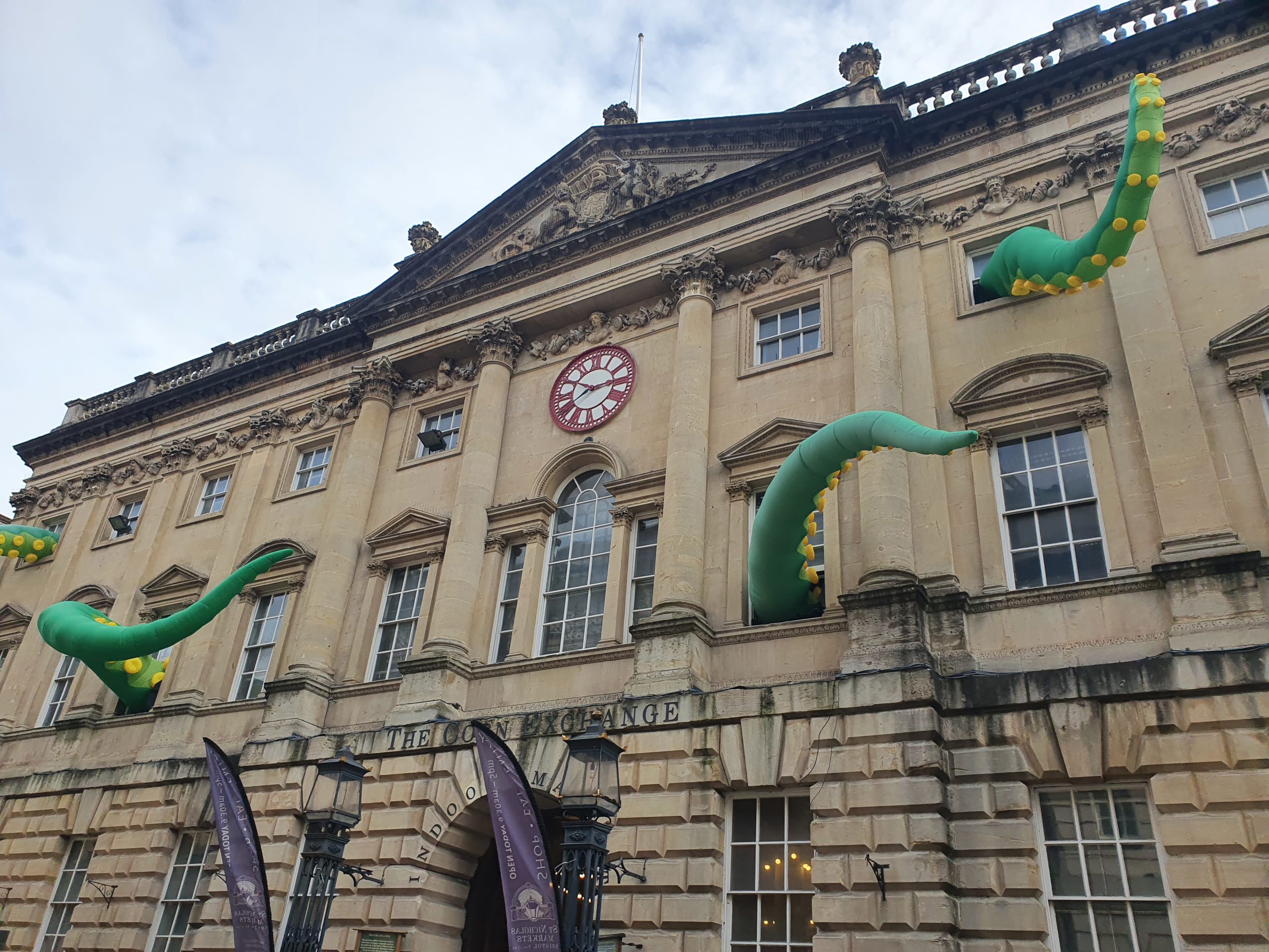 In true Bristol style, the changes are being celebrated with a giant inflatable art installation of tentacles coming through the windows of the historic Corn Exchange building, which is home to St Nick’s Market, by Designs in Air.