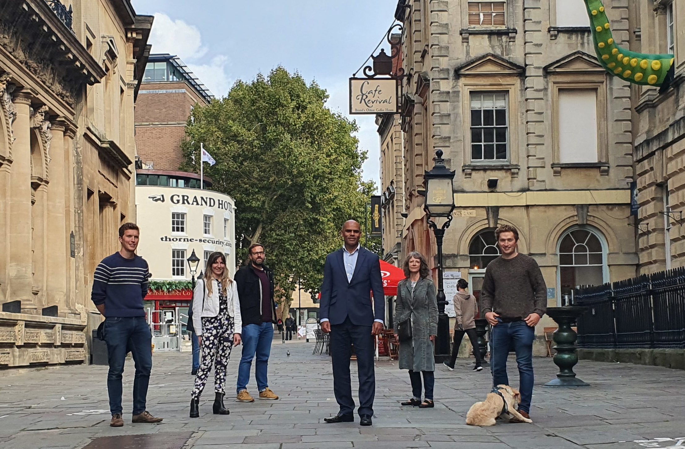 Mayor Marvin Rees with business owners and Dr Suzanne Audrey of Bristol Walking Alliance