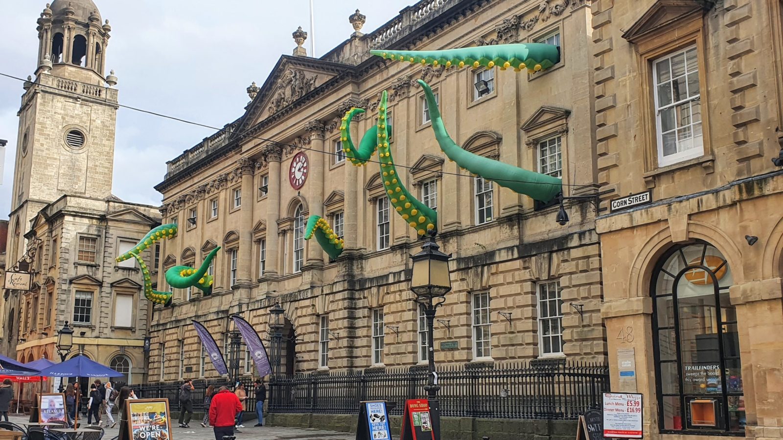 In true Bristol style, the changes are being celebrated with a giant inflatable art installation of tentacles coming through the windows of the historic Corn Exchange building, which is home to St Nick’s Market, by Designs in Air.