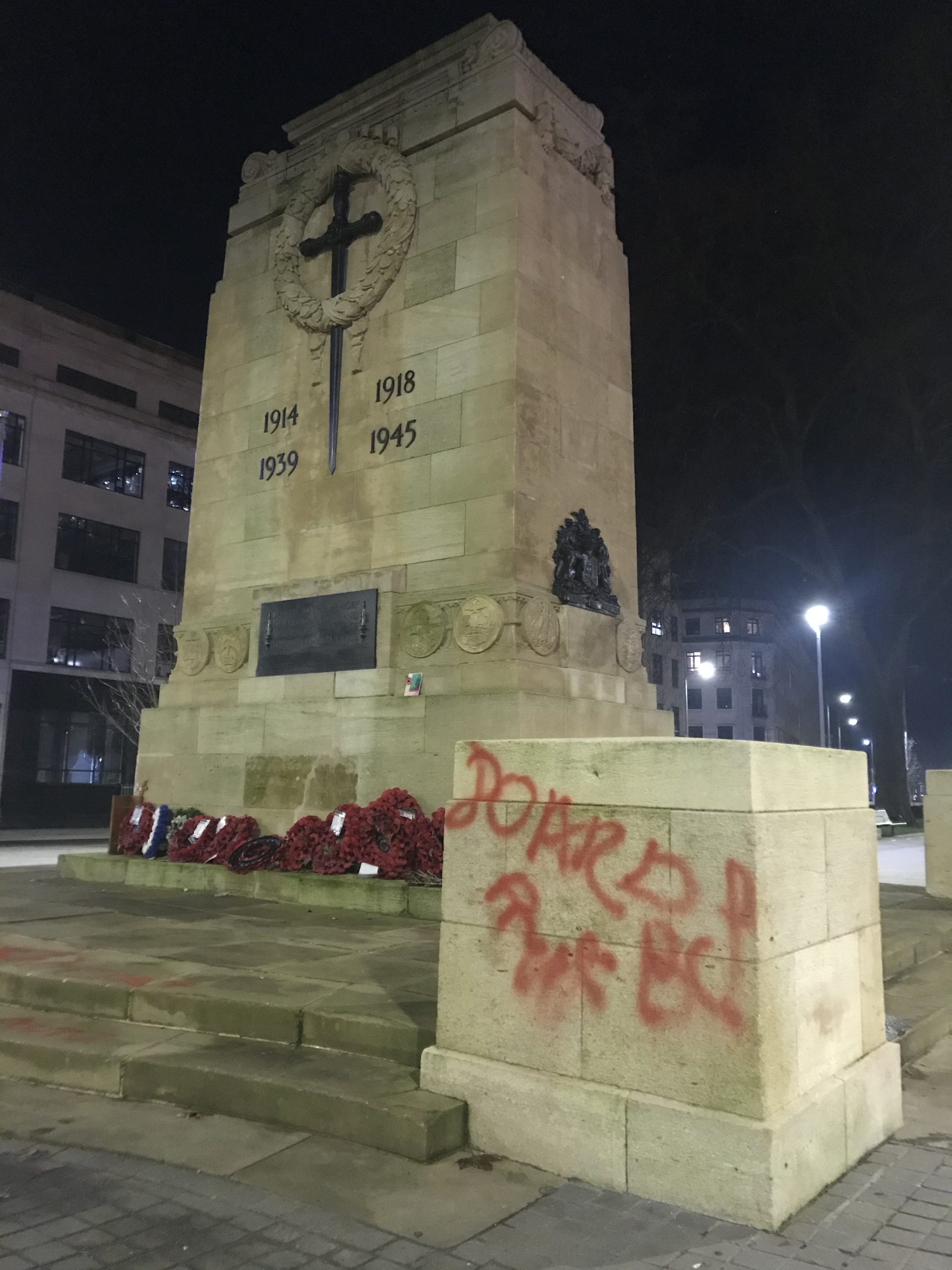 The unknown perpetrator wrote the words in red spray paint on a pair of the square blocks at each corner of the limestone memorial and on some of its stepped plinth.