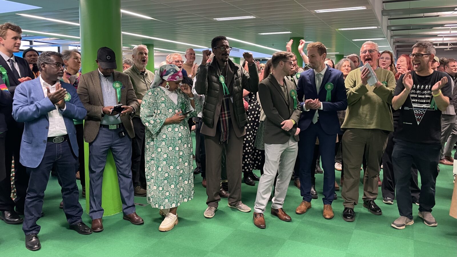 Greens celebrate at the count in Oasis Academy in Brislington – photo: Martin Booth