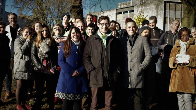 Main photo of Darren Hall and supporters in Bristol courtesy of the Green Party