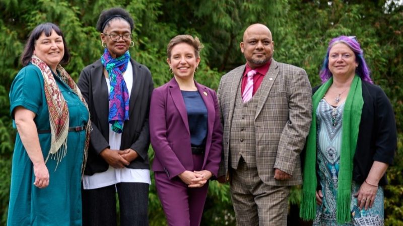 Bristol’s five Green Party general election candidates; left to right: Jai Breitnauer, Lorraine Francis, Carla Denyer, Naseem Talukdar and Mary Page – photo: Green Party
