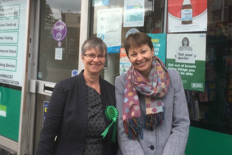 Green leader Caroline Lucas visited a chemist in Easton to launch the party’s pledge to scrap prescription charges.