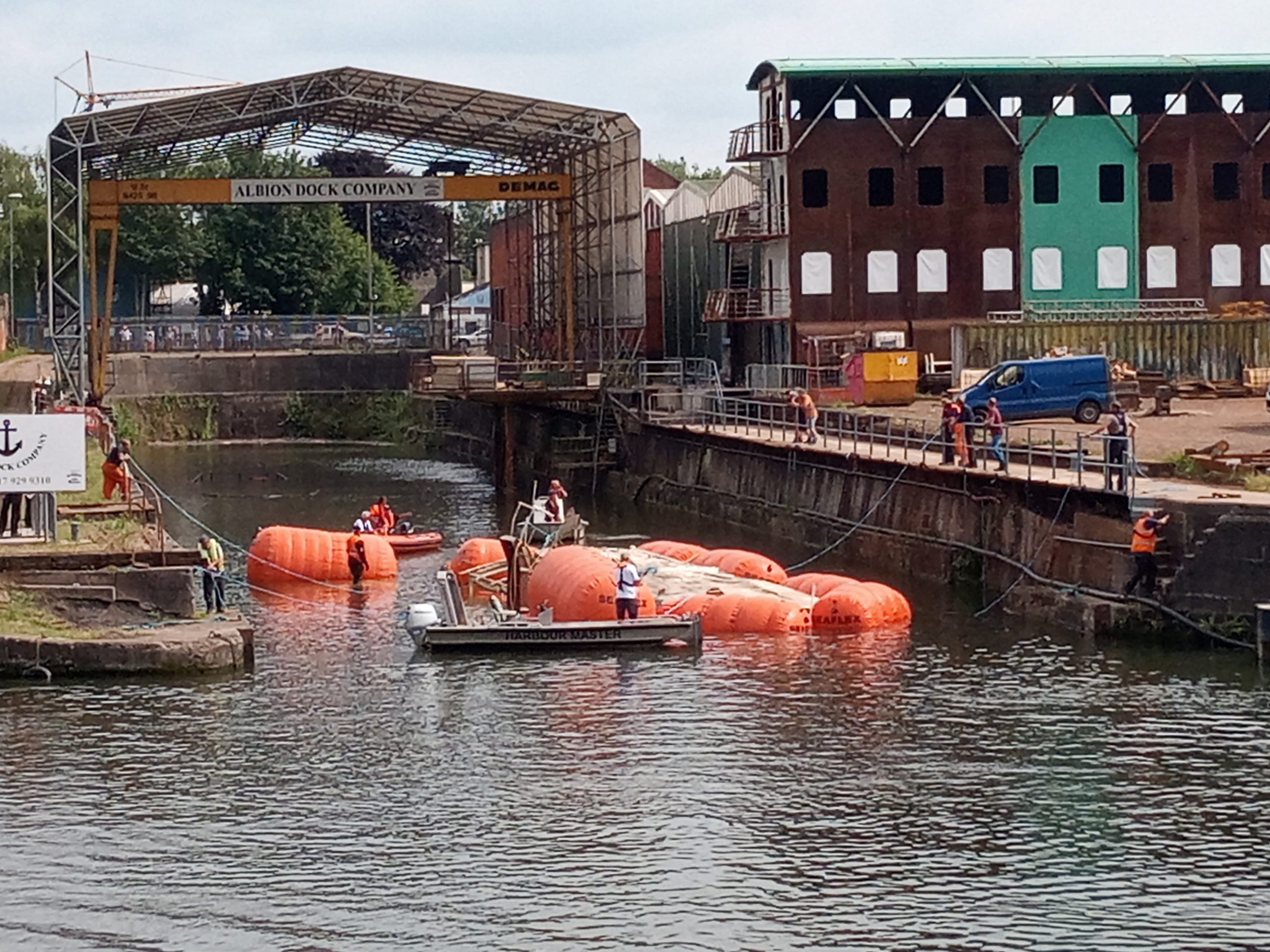 After several days of work to attach large orange inflatable balloons to both Greenshank and Robert H, they were pulled the few hundred yards to the dry dock on Friday afternoon.