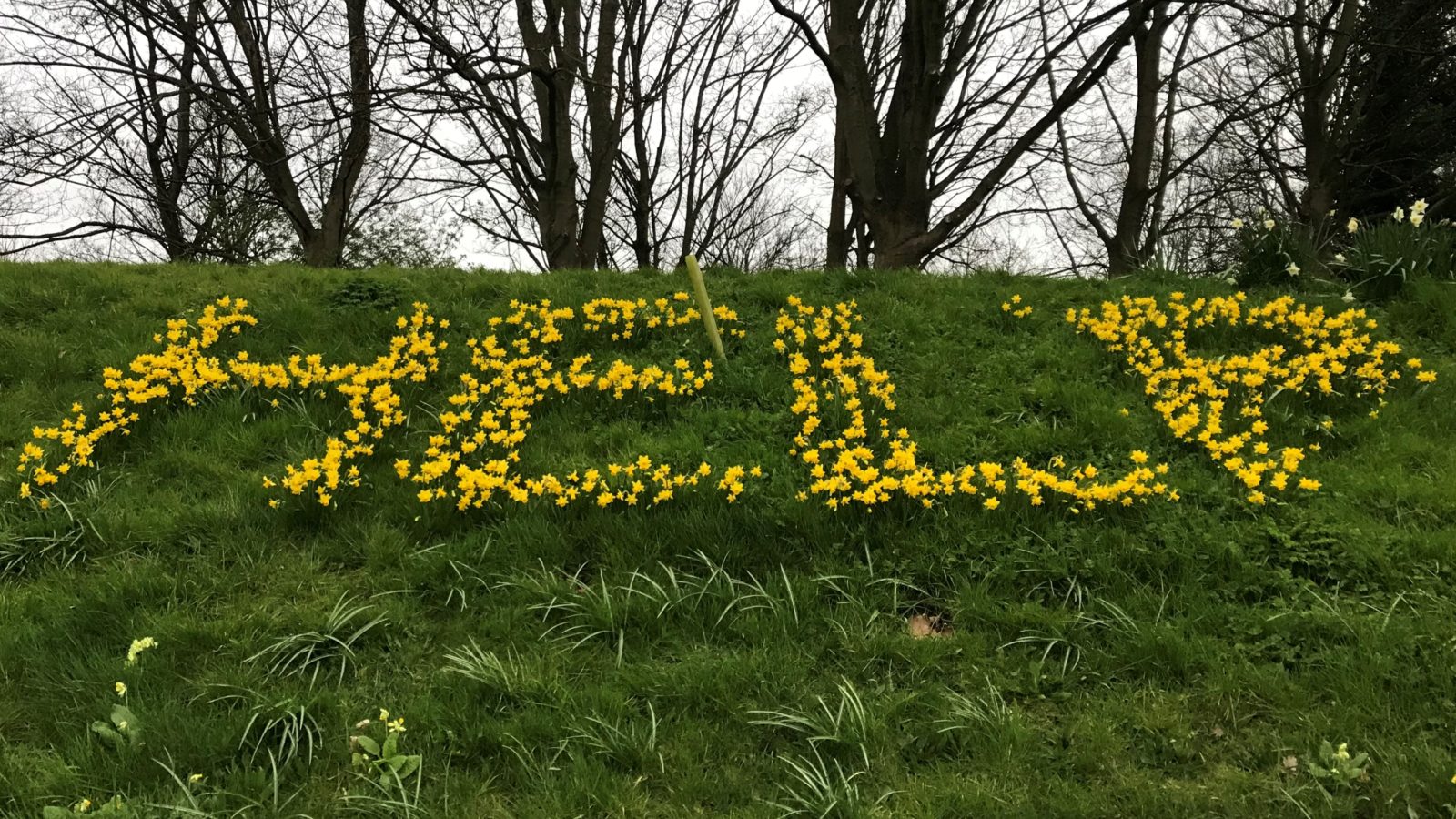 Hundreds of daffodils spell out the word ‘help’ in Riverside Park – photo: Martin Booth