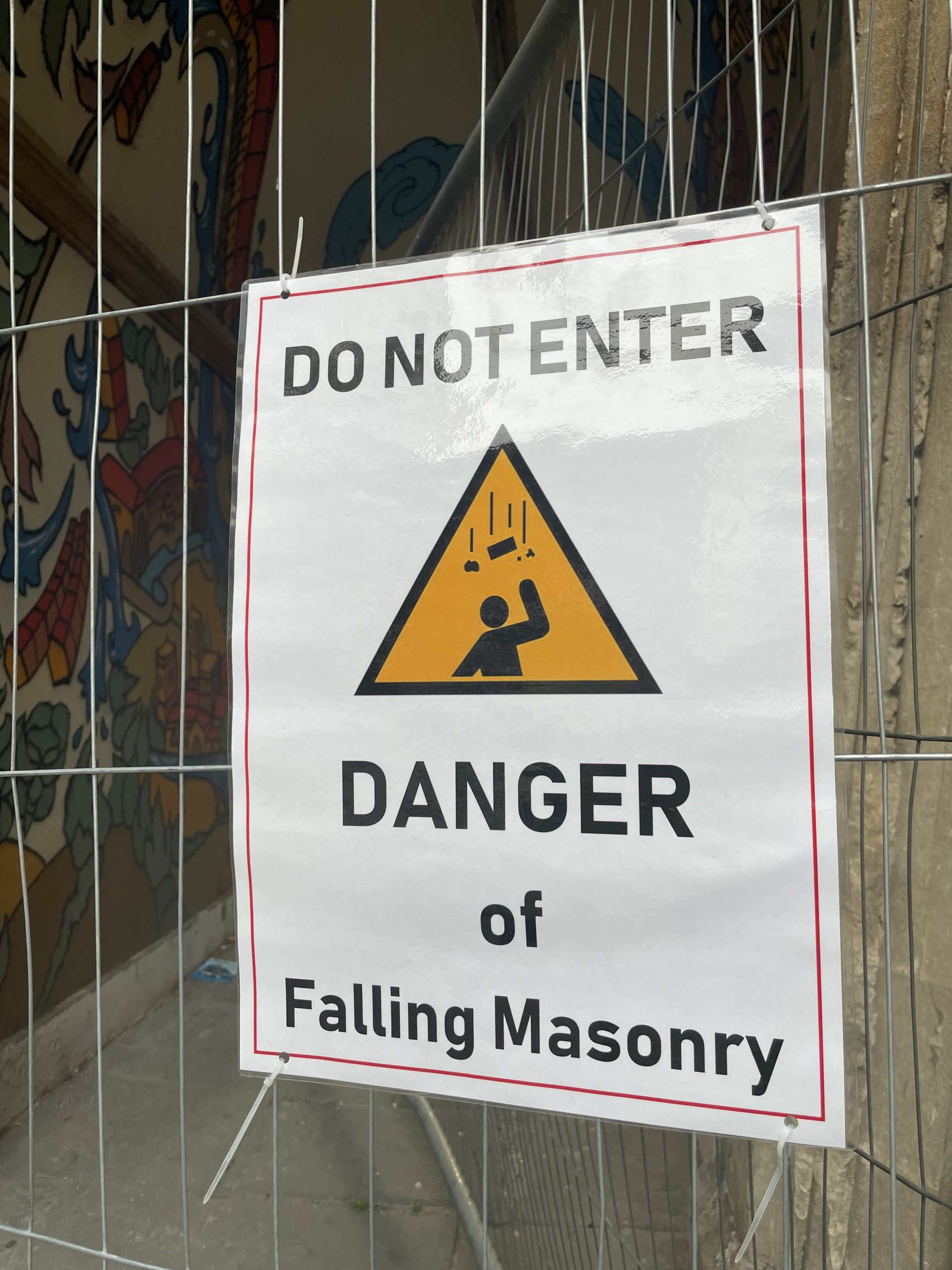 The church’s original gateway and its two newer side walkways have been closed due to the danger of falling masonry from the spire