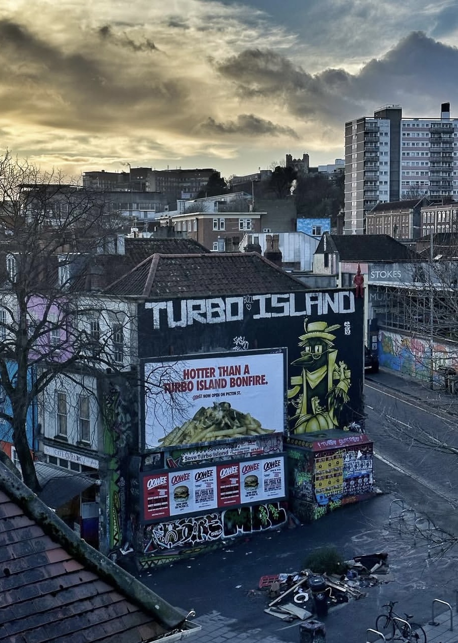 ‘Hotter than a Turbo Island bonfire’ reads the slogan on the billboard looking down on the infamous empty patch of land on the corner of Stokes Croft and Jamaica Street.