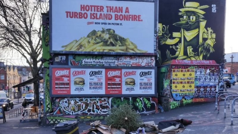 ‘Hotter than a Turbo Island bonfire’ reads the slogan on the billboard looking down on the infamous empty patch of land on the corner of Stokes Croft and Jamaica Street.