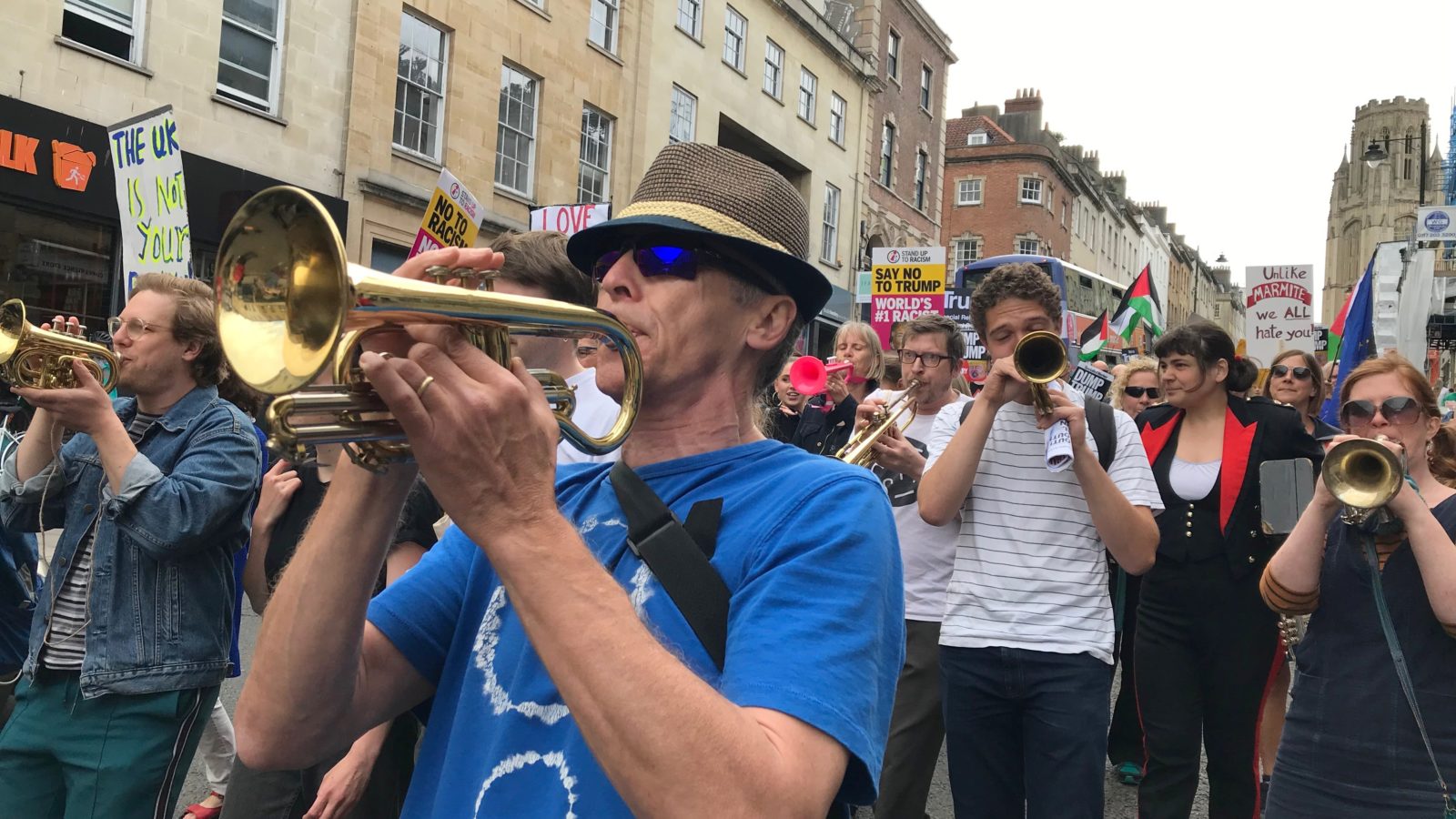 The protesters were led by musicians and a banner reading ‘Trumpets against Trump’ on the front and ‘Blast fascism’ on the back.