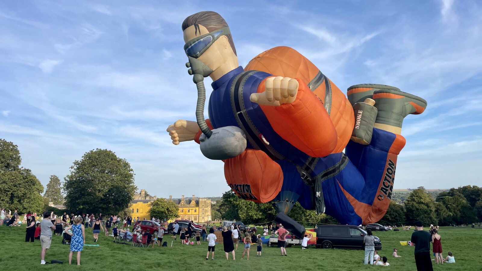 Hundreds of people, young and old, gathered in Ashton Court Estate on Sunday evening to catch a glimpse of a giant Action Man-shaped hot air balloon being inflated.
