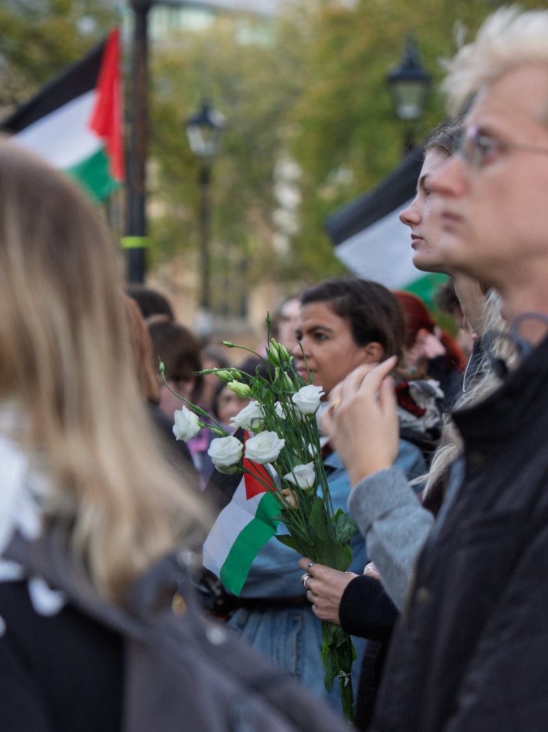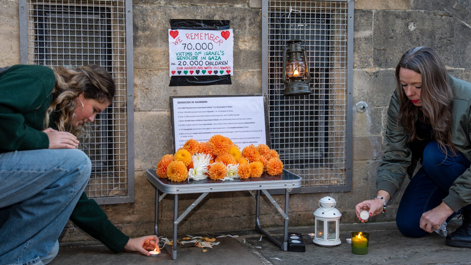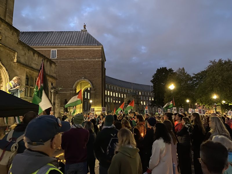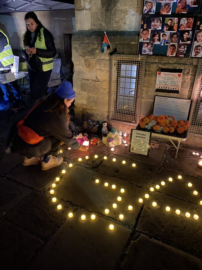 The display, led by Bristol Palestine Solidarity Campaign, hosted a number of speakers, as well as encouraging the public to lay flowers and light candles to honour the lives lost in the last two years.