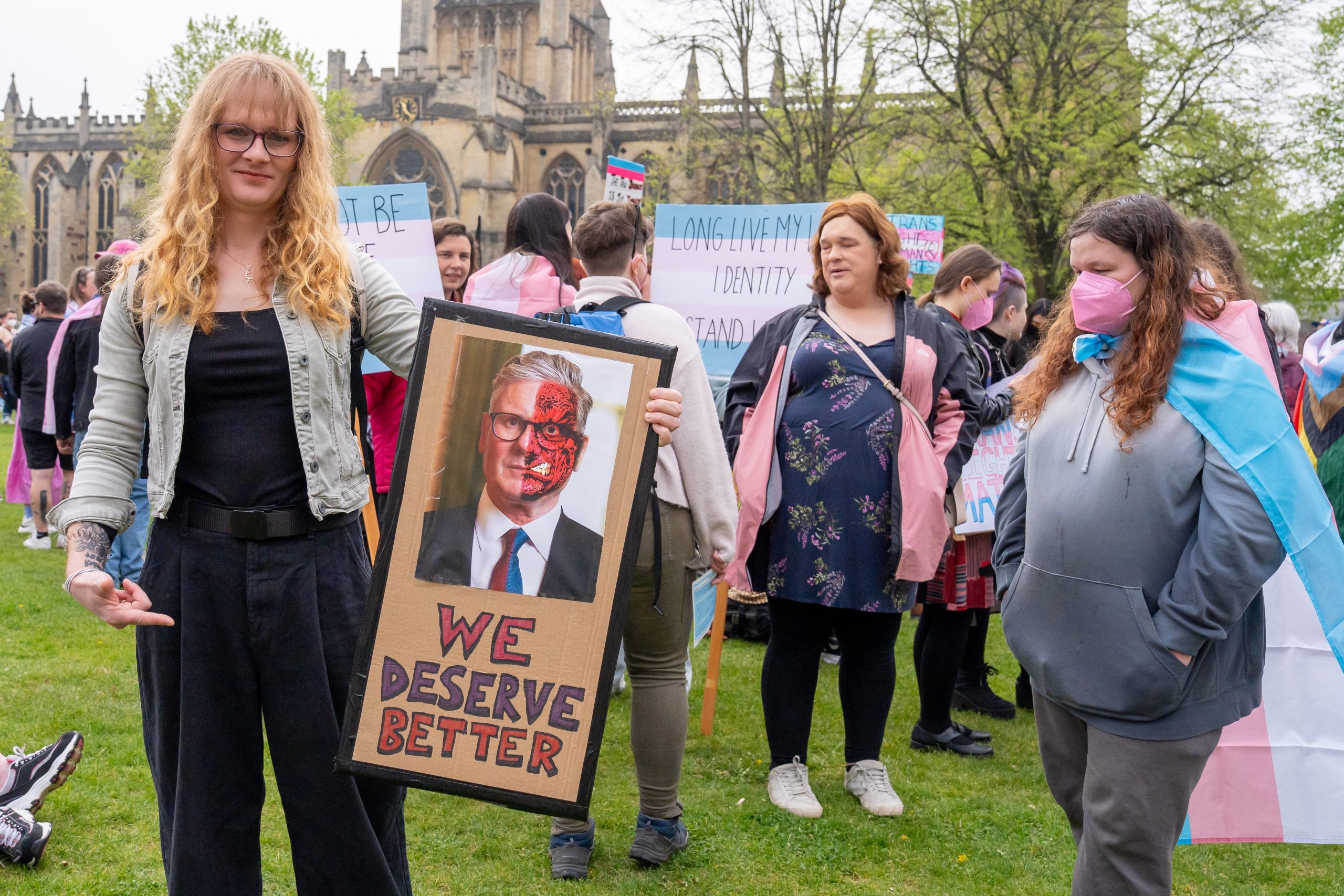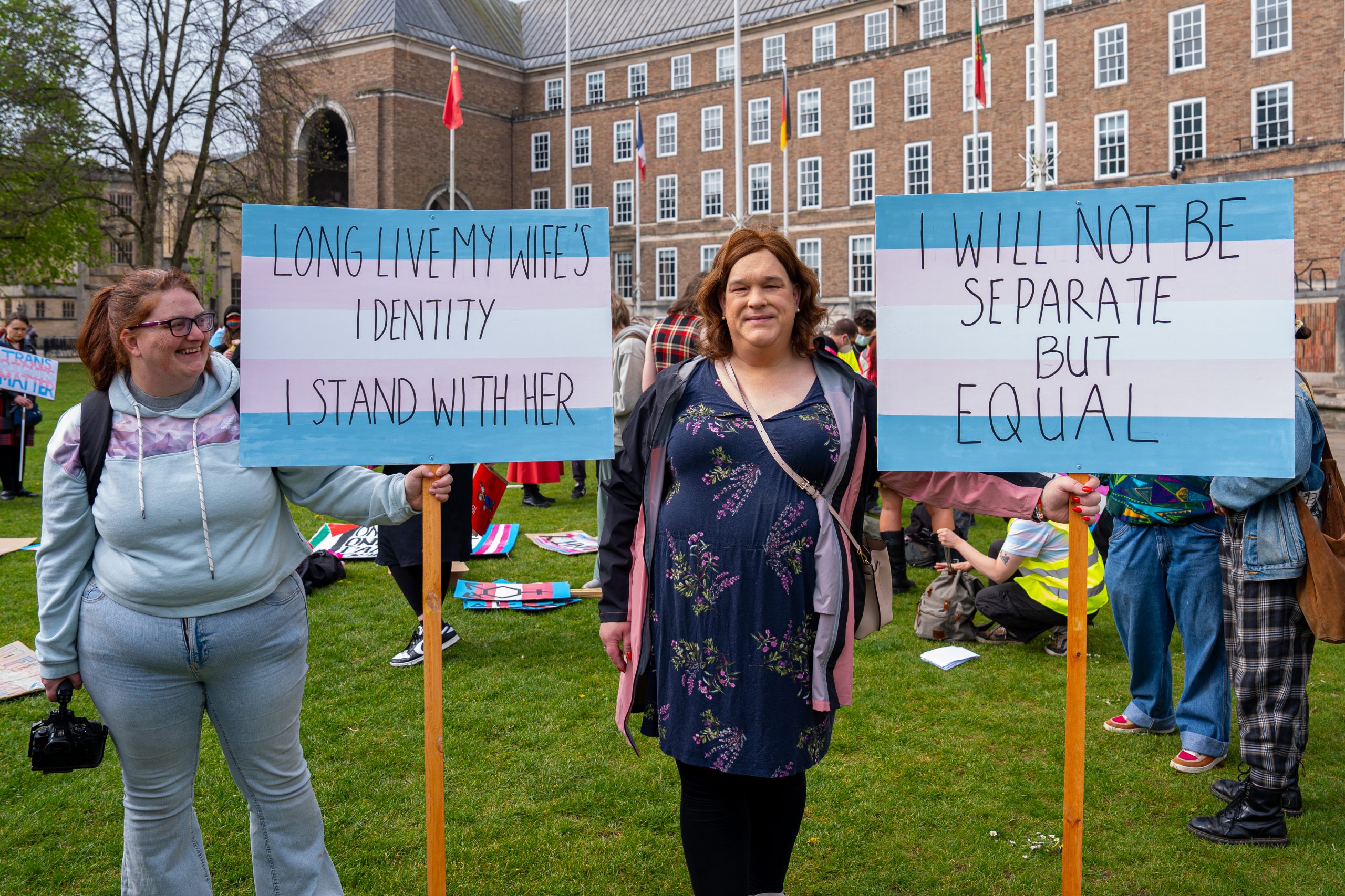 A trans woman’s wife was seen holding a pla card in support of her identity