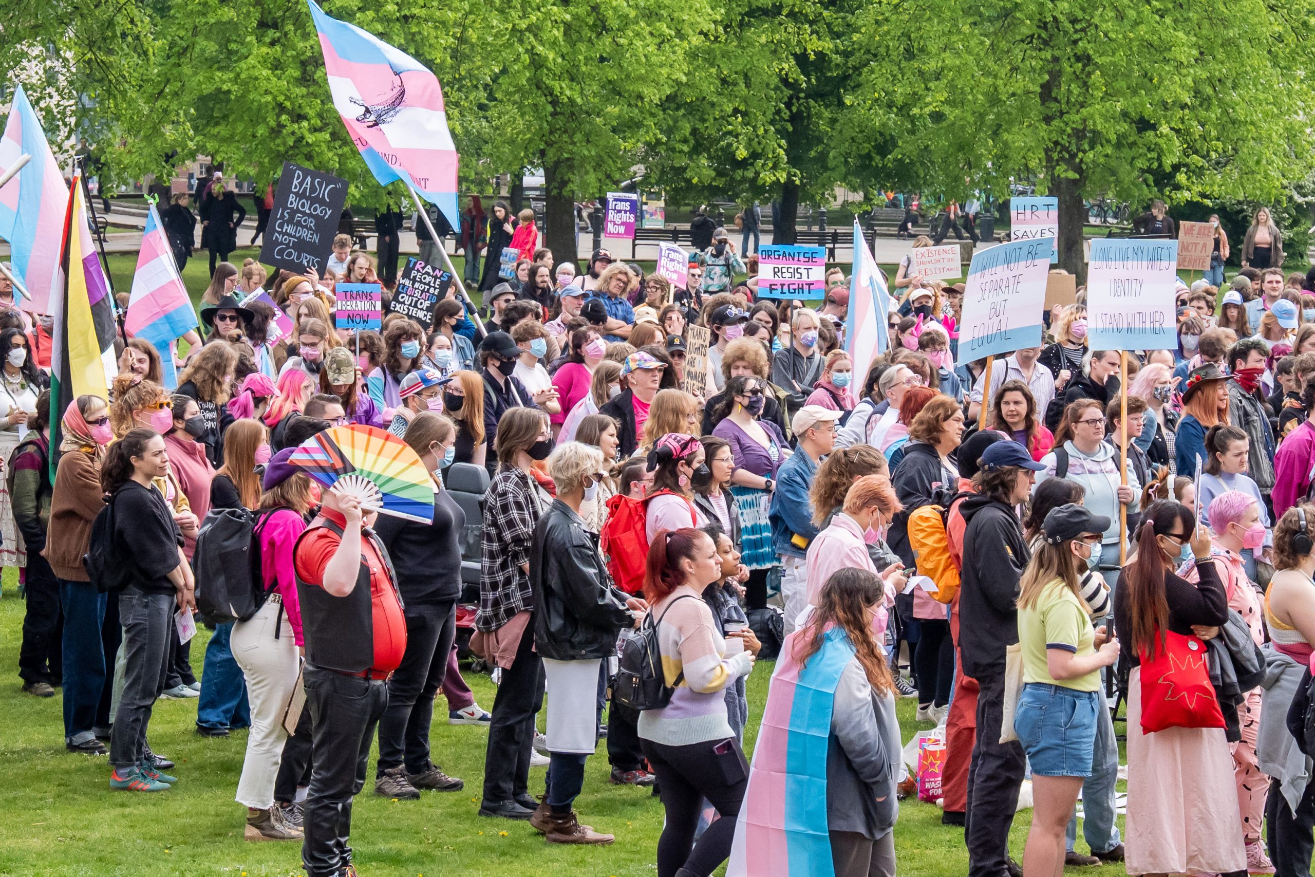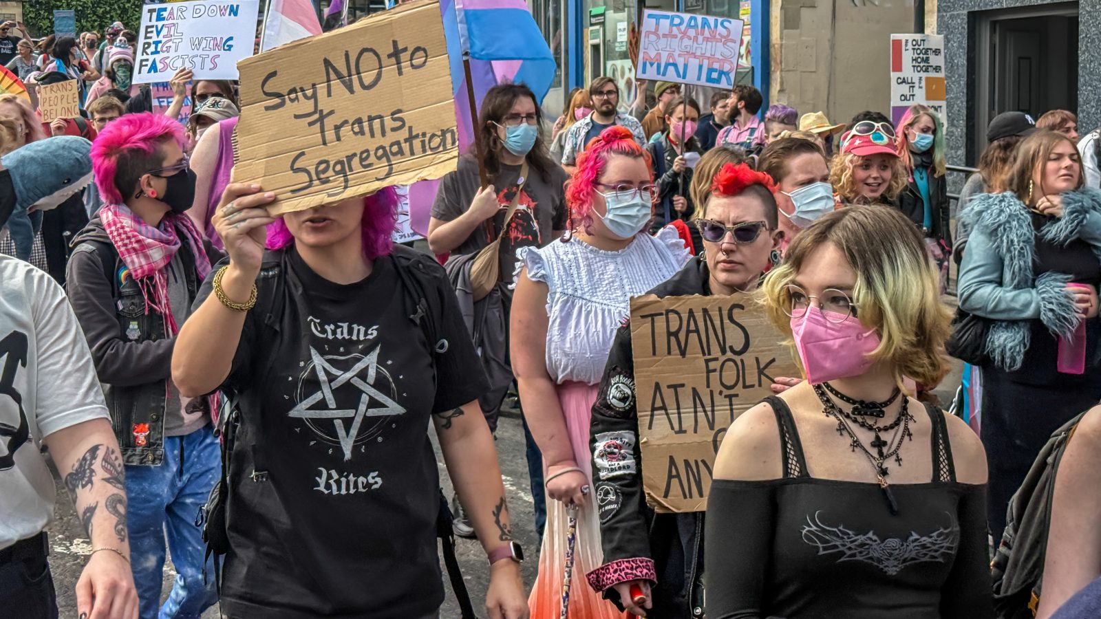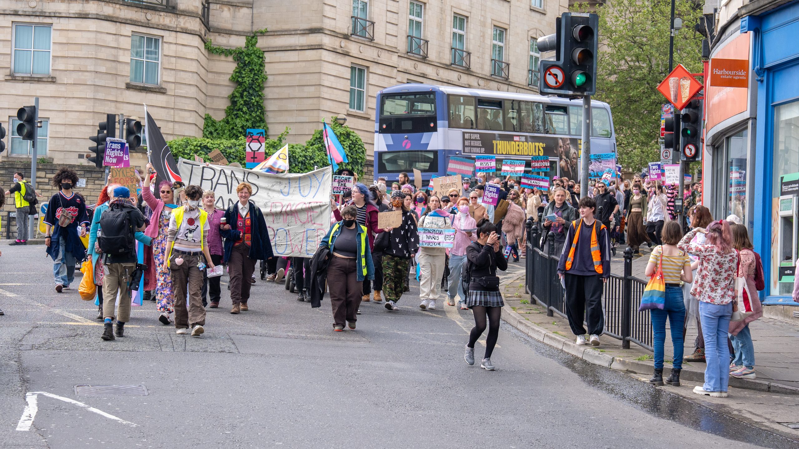 In a leaflet handed out before they started marching from College Green on Saturday, the Trans Resistance Action Network explained that as a result of the ruling, trans women “are not counted as women when it comes to sex-related rules” and will “not be included in statistics” about the presence of women in certain groups or jobs.