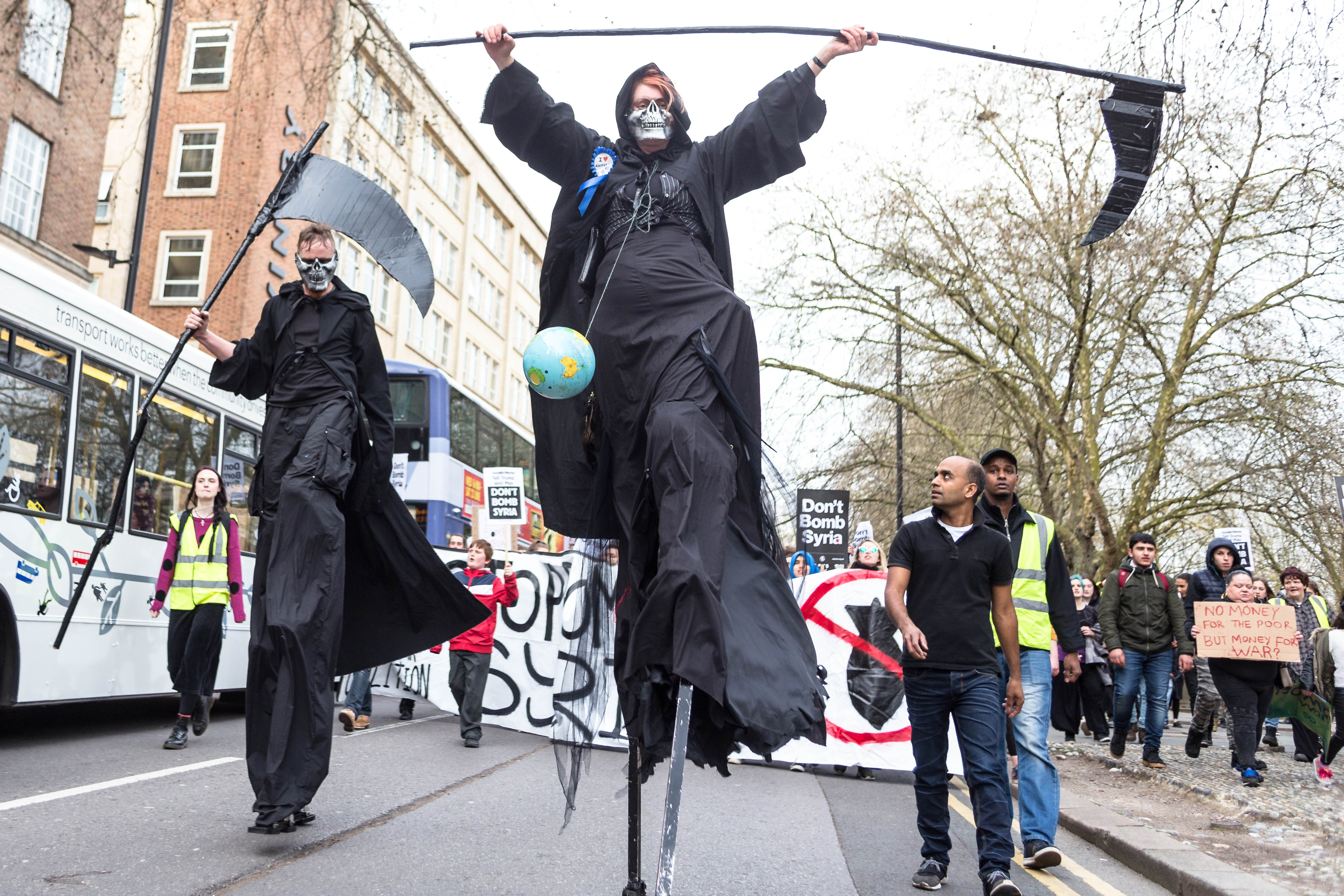 Led by two giant grim reapers on stilts, hundreds of people took to the streets of Bristol on Monday evening to protest against the recent bombing raids on Syria carried out by the UK, USA and France.