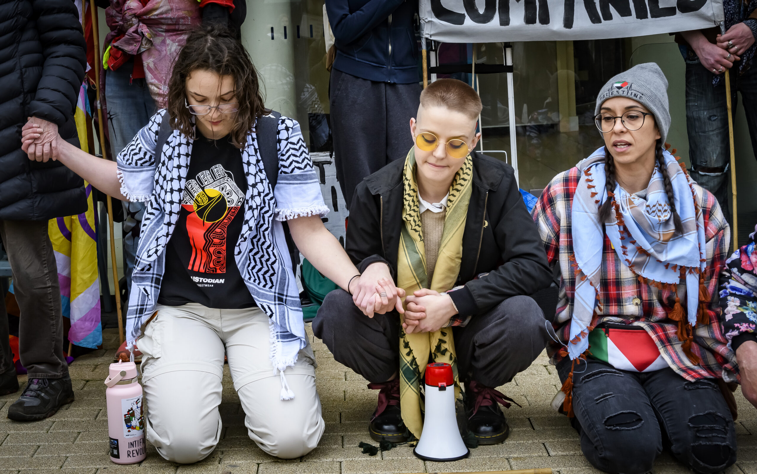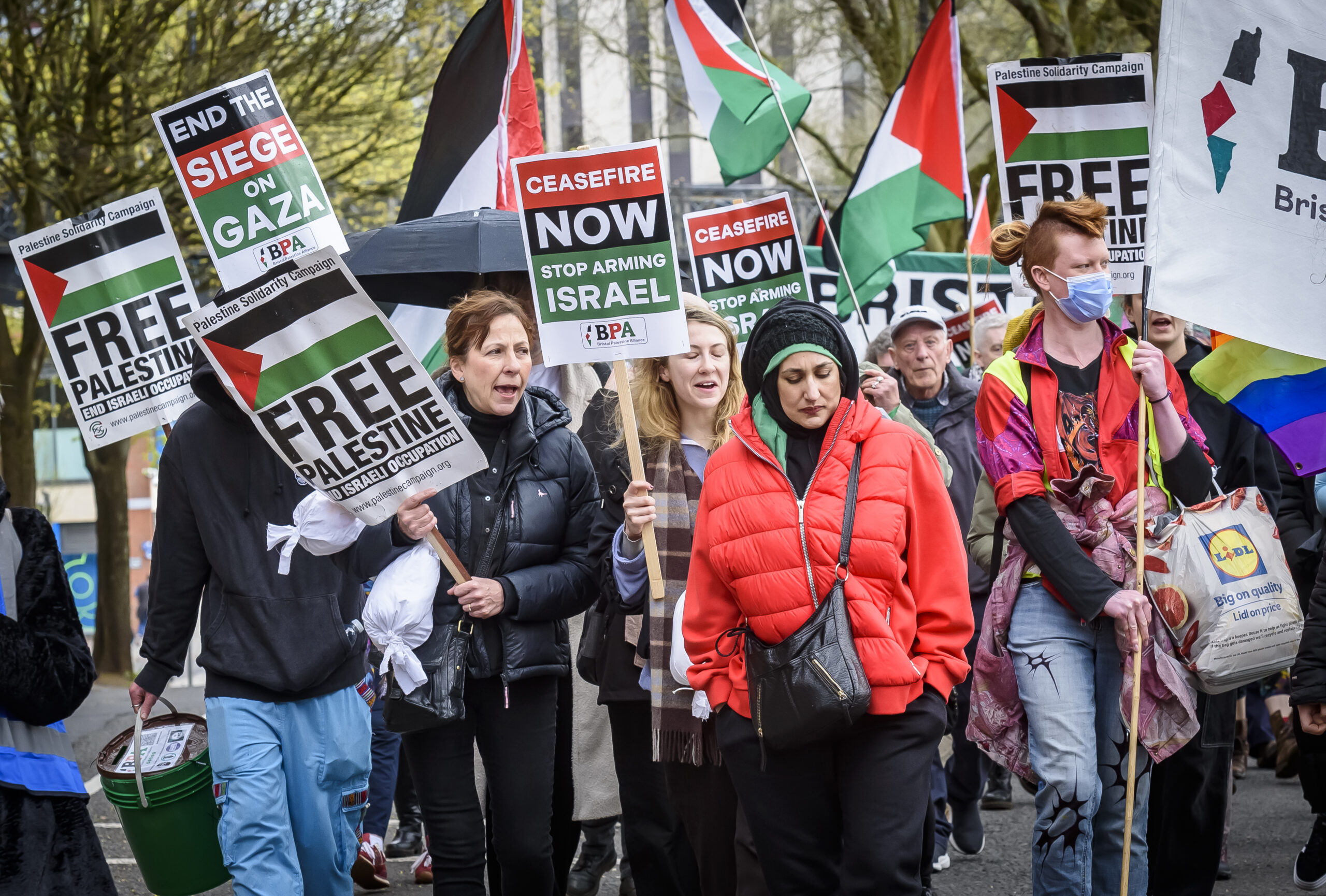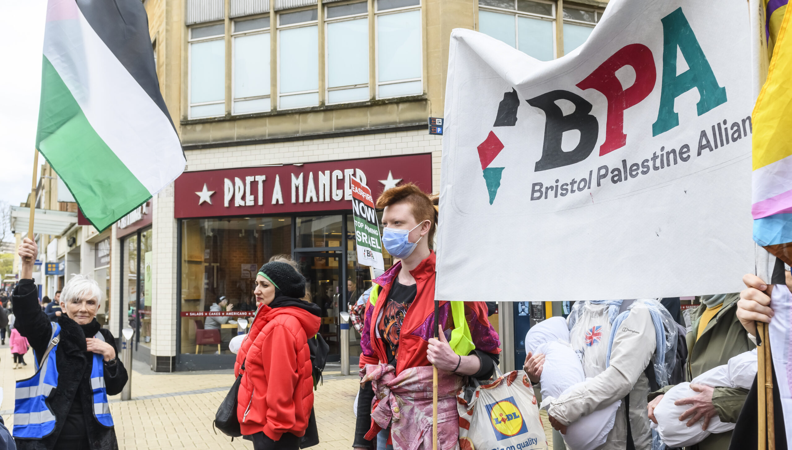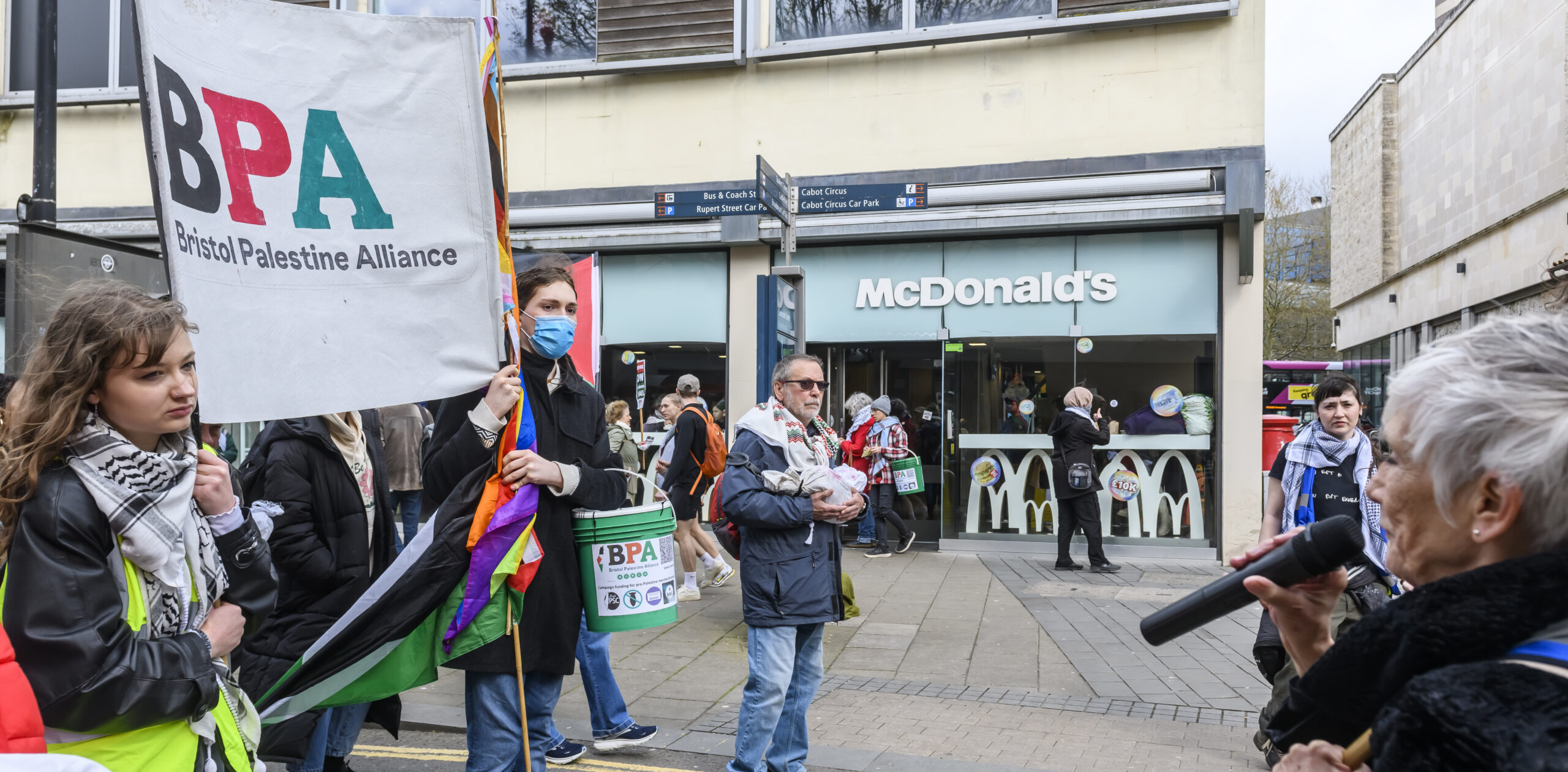 Organised by Bristol Palestine Alliance, the march stopped to protest outside the buildings of companies they say stock Israeli products or support the military attacks on Gaza in some way.