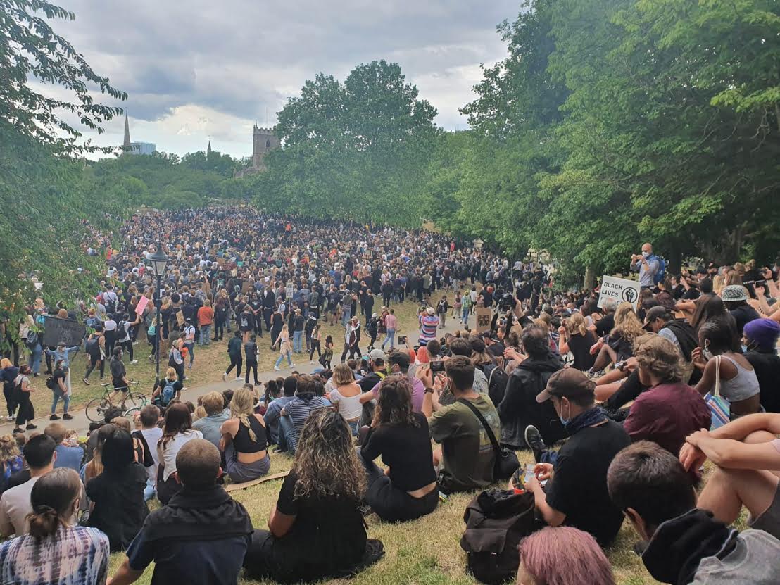 The crowd split into two main groups, those at the Colston statue site and Castle Park. Photo: Ellie Pipe