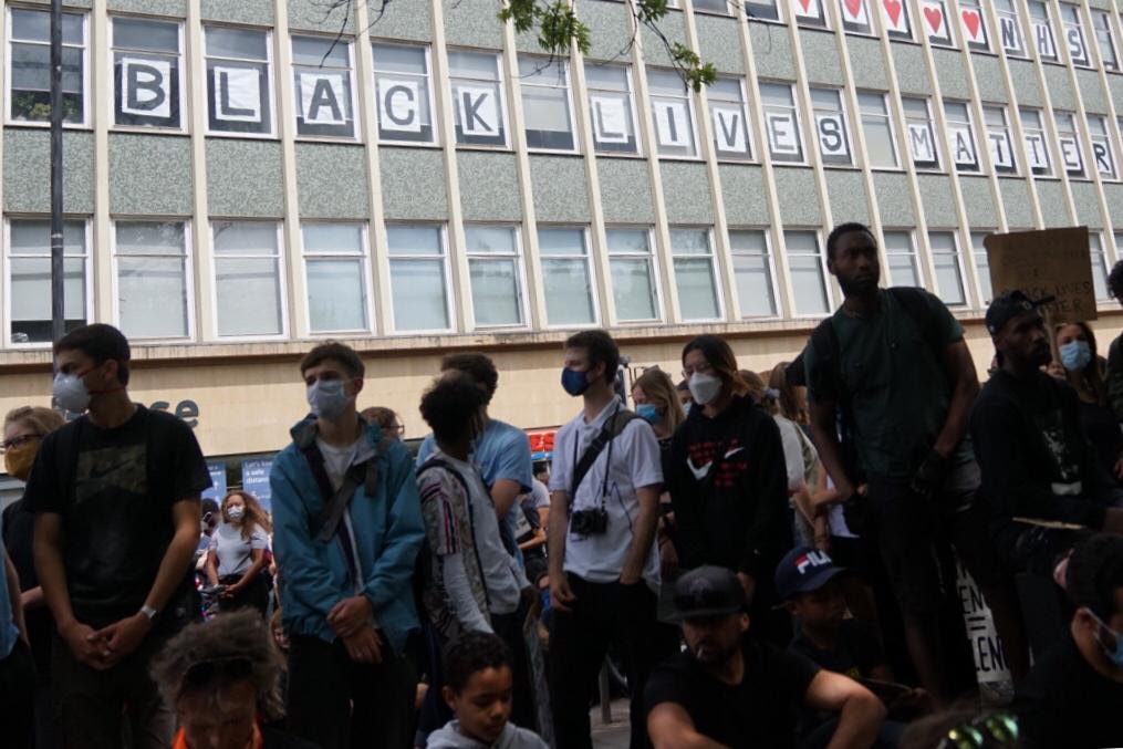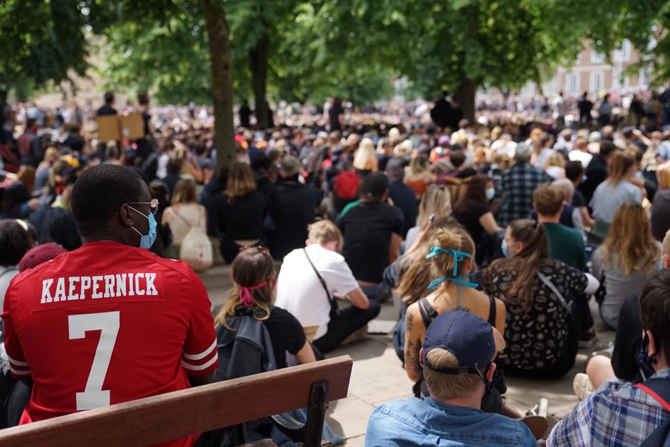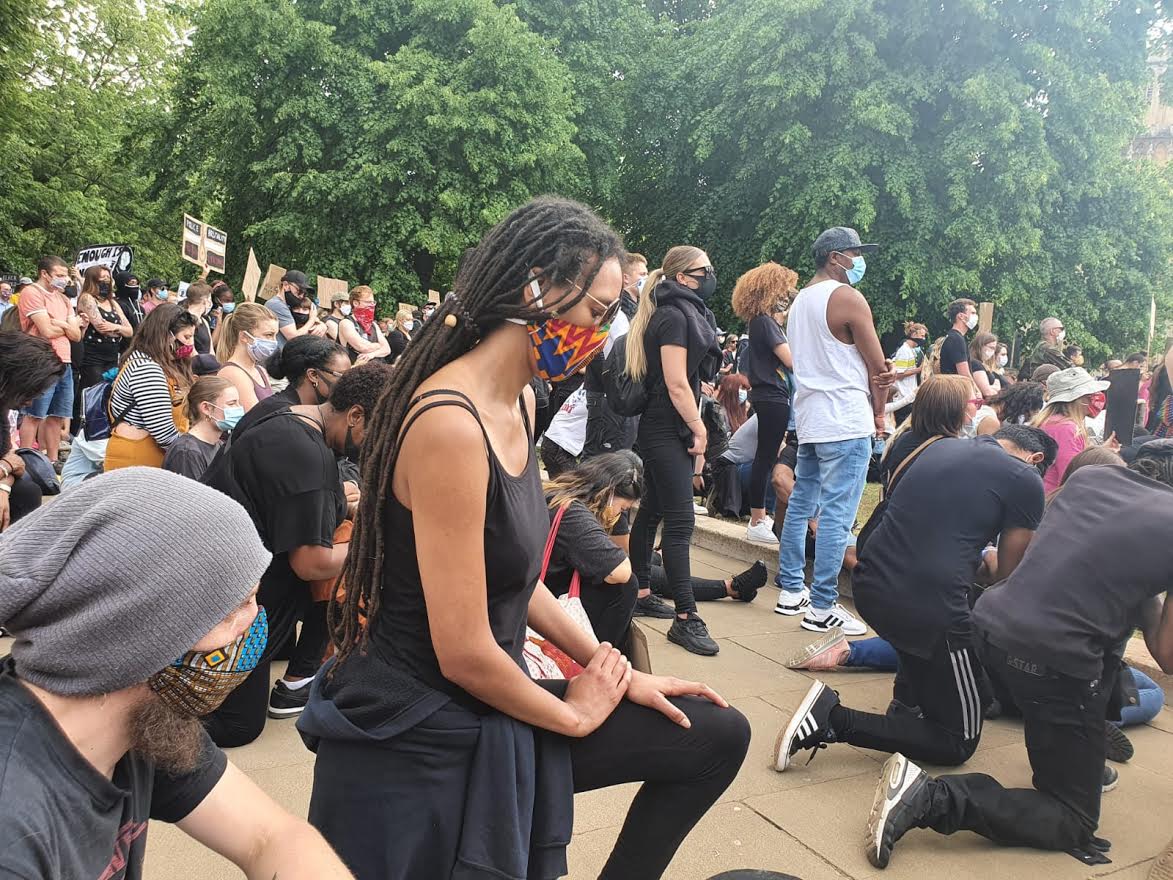Protester take the knee. Photo: Ellie Pipe