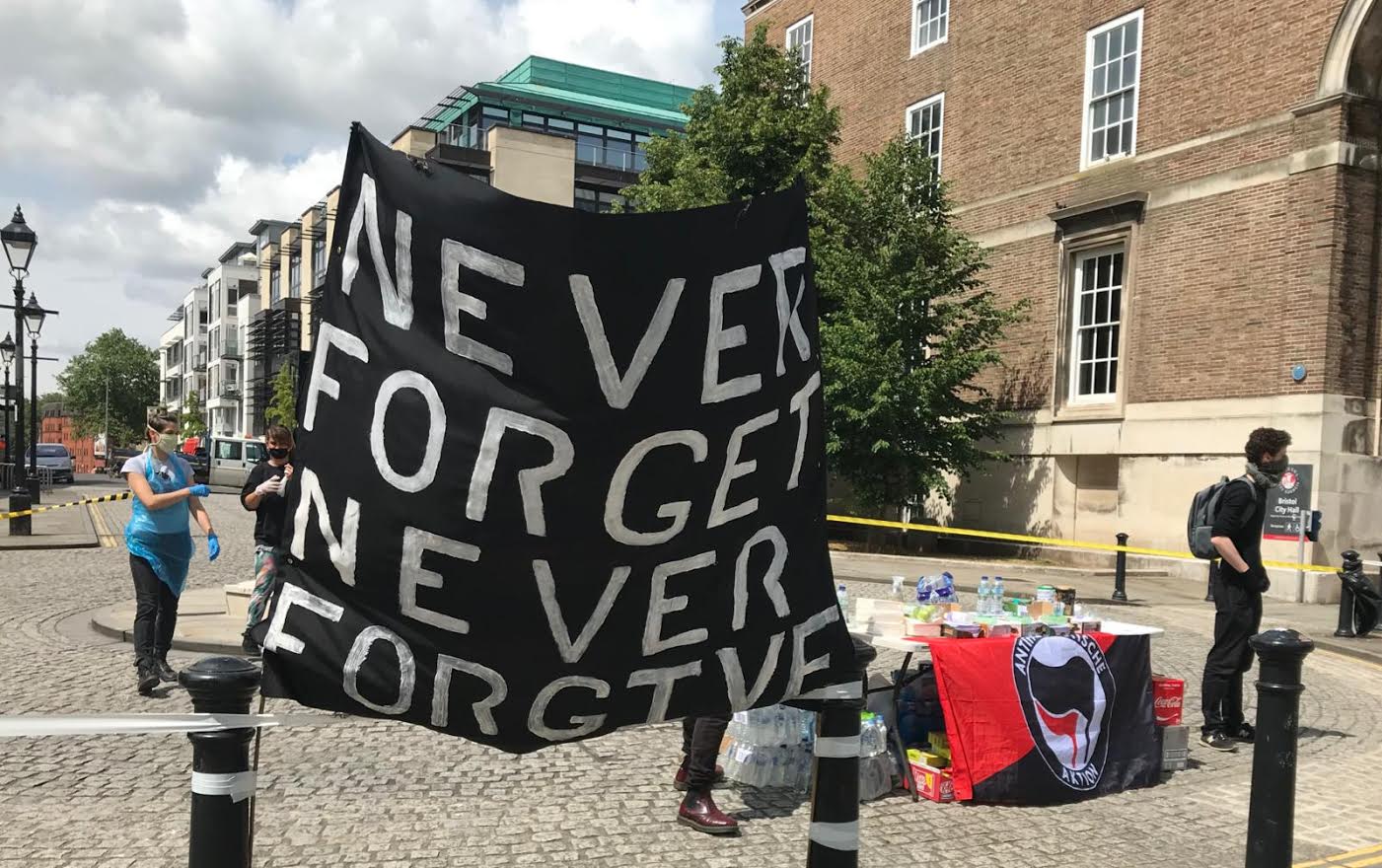 Colston Hall gets covered up, with people cheering as they walk past. Photo: Ellie Pipe